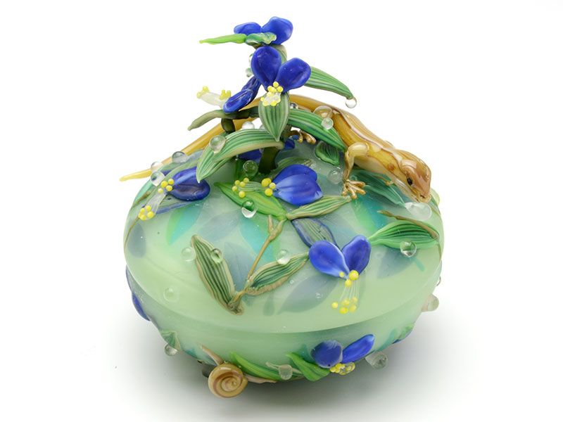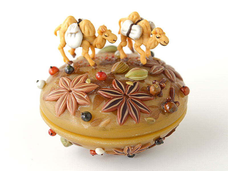 異国への憧れ、ワクワクする気持ちがくすぐられる作品です。眺めていると、幾重にも重なった香辛料のかぐわしい香りが漂ってくるようでもあります。華奢で繊細に表現された駱駝が、蓋物の表面の華やかさをより引きたてる“スパイス”になっていると感じます。様々な形・色の香辛料が重なり合い、その殆どがマットな質感のガラスで構成されていますが、単調さを感じさせずに愉快なリズミカルさを演出している…作家のセンスが光る大人の作品だと思いました。(W.H)