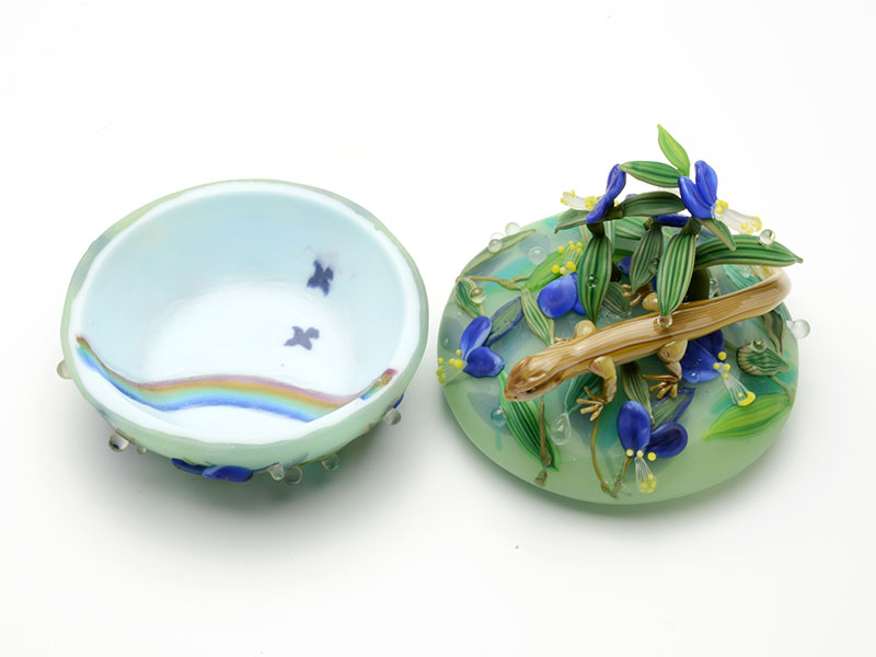 この作品を見た時に改めて、ガラスという素材の美しさを感じたのを覚えています。艶消しの表現が比較的多かった秋葉さんですが、艶消しと艶有りを上手く使い分け雨あがりの様子を生き生きと表現されています。爬虫類をモチーフとすることも珍しく、艶めかしい蜥蜴も美しい。7年前の作品ですが強く印象に残っている作品です。(T.K)