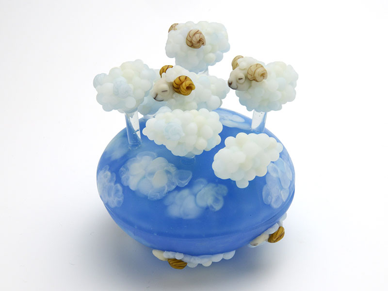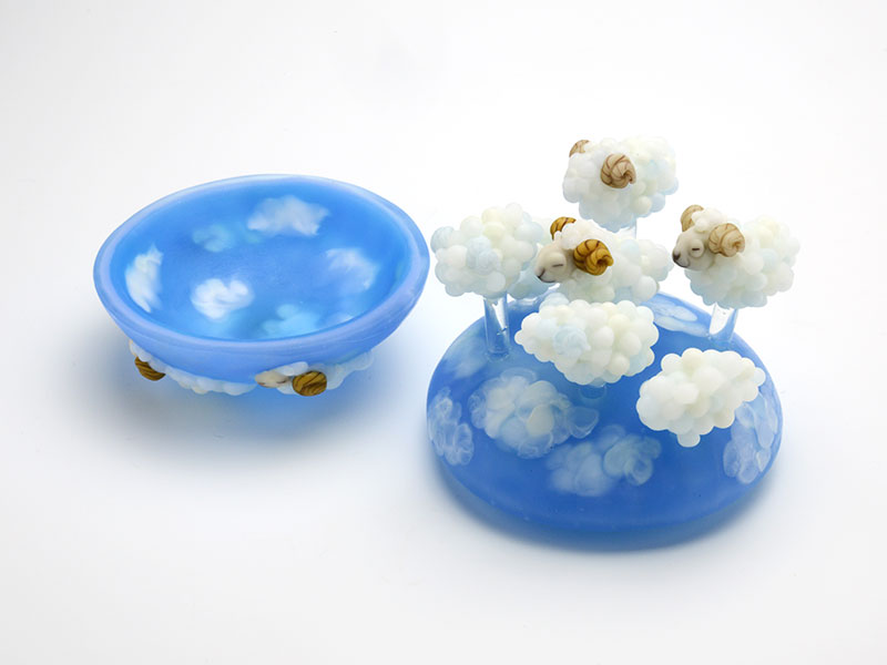 ガラス素材の持つ透明度と不透明度の交錯する性質を、文学的、もしくは形而上的な匂いへと昇華している世界観が好きです。また、爽やかで深い青と抜けるような白の組み合わせに、雲と羊のリズミカルに連続するフォルムが、飛翔感を感じさせてくれて、元気になれる作品です。(H.H)