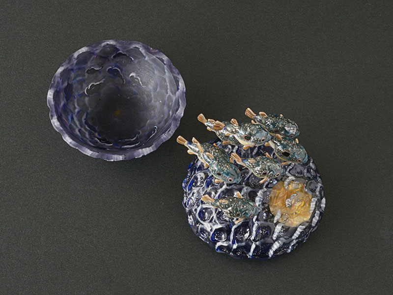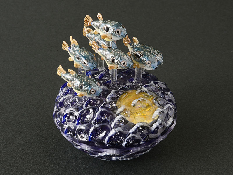 満月の夜、フグの群れが産卵のために集まってくる光景。群泳するフグ達、ざわめく水面。ガラスの透明感、震えるような生命感を感じさせる密度の高い作品だと思います。海の神秘が見事に表現されています。秋葉さんが長年住み慣れた海のある町から引っ越す時に、想いを込めて作られた作品です。(T.H)