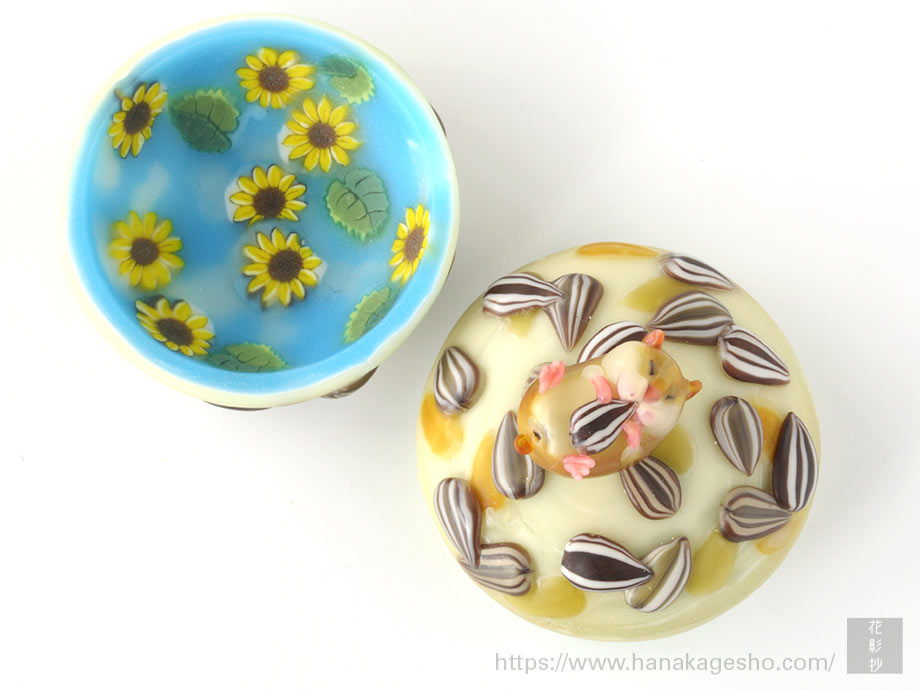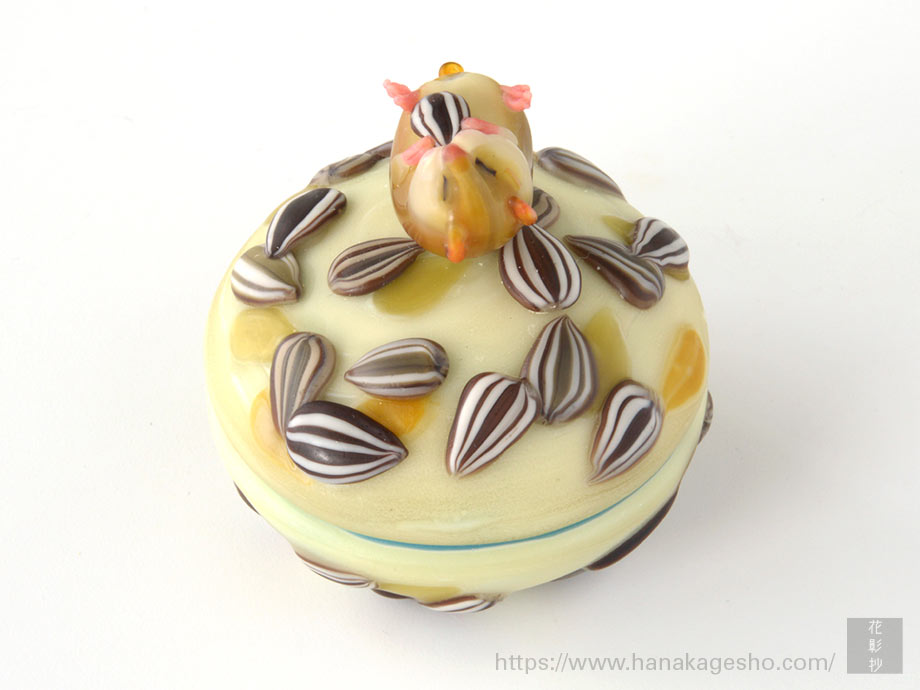 向日葵ひとつの花からできる種は、大輪の花だと2000粒程にもなるそうです。 縞模様を纏った楽しげな種。たった一粒の種の向こう側、青空に映える向日葵畑が目に浮かぶようです。