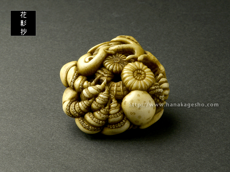 蛸、クラゲ サンゴ、モクレンで花籠を見立てた根付。縁起が良い。十文字蛸モチーフ。(見立て形彫り)