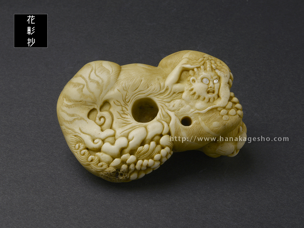 水流で悪鬼を流す虎の根付。新型コロナウイルス化身の鬼を配置しました。(古根付風)