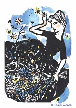今年の個展は、福音館書店月刊誌「おおきなポケット」08年2月号に掲載された「お星さまは、いかがです?」(作:林原玉枝)での原画9点をはじめ、星をテーマにした木版画を展示します。