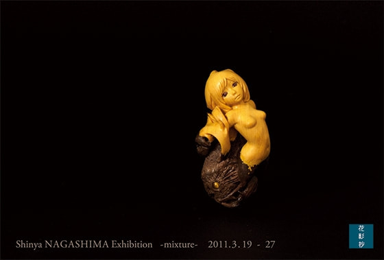 ■日本の伝統美術工芸品の「根付」に造形を学びつつ、手のひらサイズの感覚の中で、どのような表現ができるか模索中の永島。大学卒業後初となった前回の個展では、自分にとっての憧れの存在として、爬虫類などの生物やアニメから出て来たような女性のイメージを彫り出してみせた。二回目の本展では、タイトルを「mixture」とした。永島作品の中に、ダブルイメージの融合するものがしばしば見られるわけだが、自身の作品の在り方を考える上で、実用の美として生まれ手のひらで愛玩される「根付芸術」と「現代に生きる自身の世界観」のさらなる融合を目指すことと思われる。
