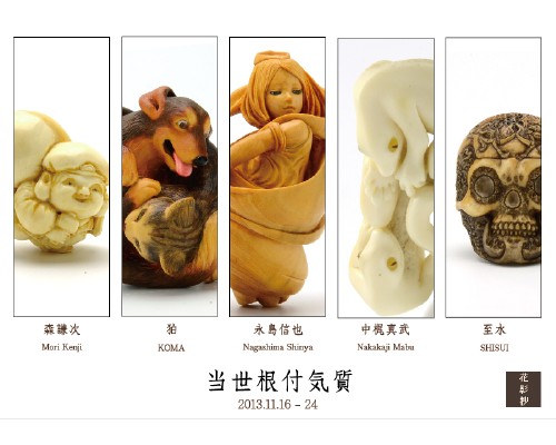 今回の展覧会は「当世根付気質 トウセイネツケカタギ」としました。 近年、根付に興味を持ち、向き合い始めた比較的新しい作家たちを中心に集まってもらい、今を生きている作家の息づかいが感じられる、そんな根付を皆様に御覧頂きたいと思います。