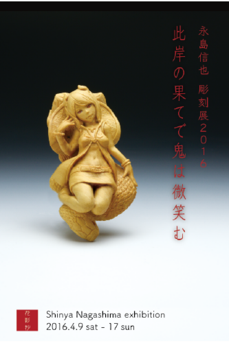永島信也は、根付彫刻というジャンルに、まったく新しい「現代的な美少女像」を持ち込み展開している作家である。島根県(出雲の国)に生まれ、子供の頃から眼には見えない世界(神々の住む世界)を自然に受け容れていたという彼にとって、アニメやゲームの世界に登場する美少女やドラゴンは身近な存在。永島は、そうした二次元のモチーフを木彫・牙彫という古典的な素材と技法によって具現化させ、幅広い年代に支持を得ている。