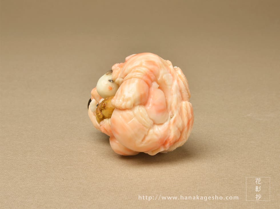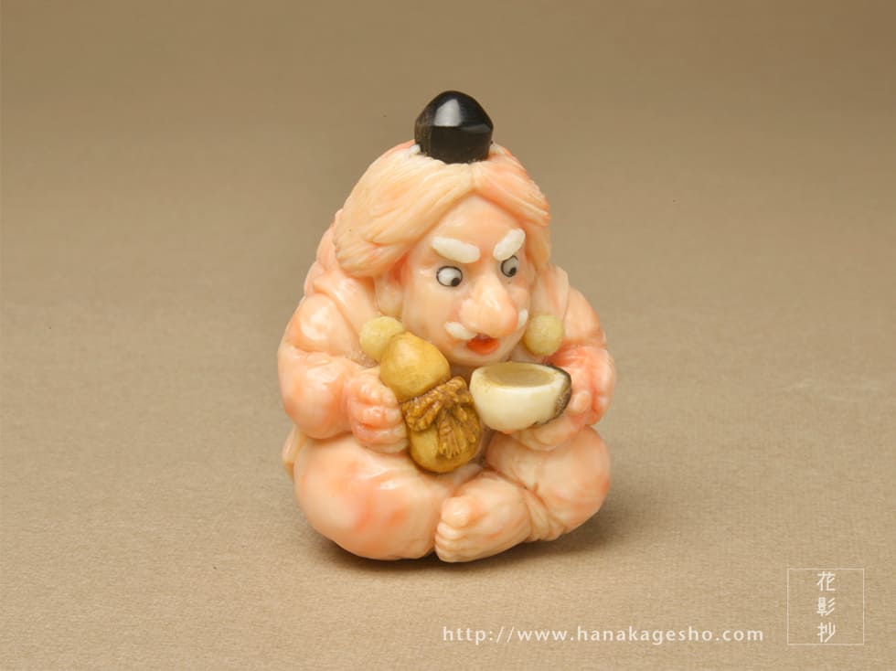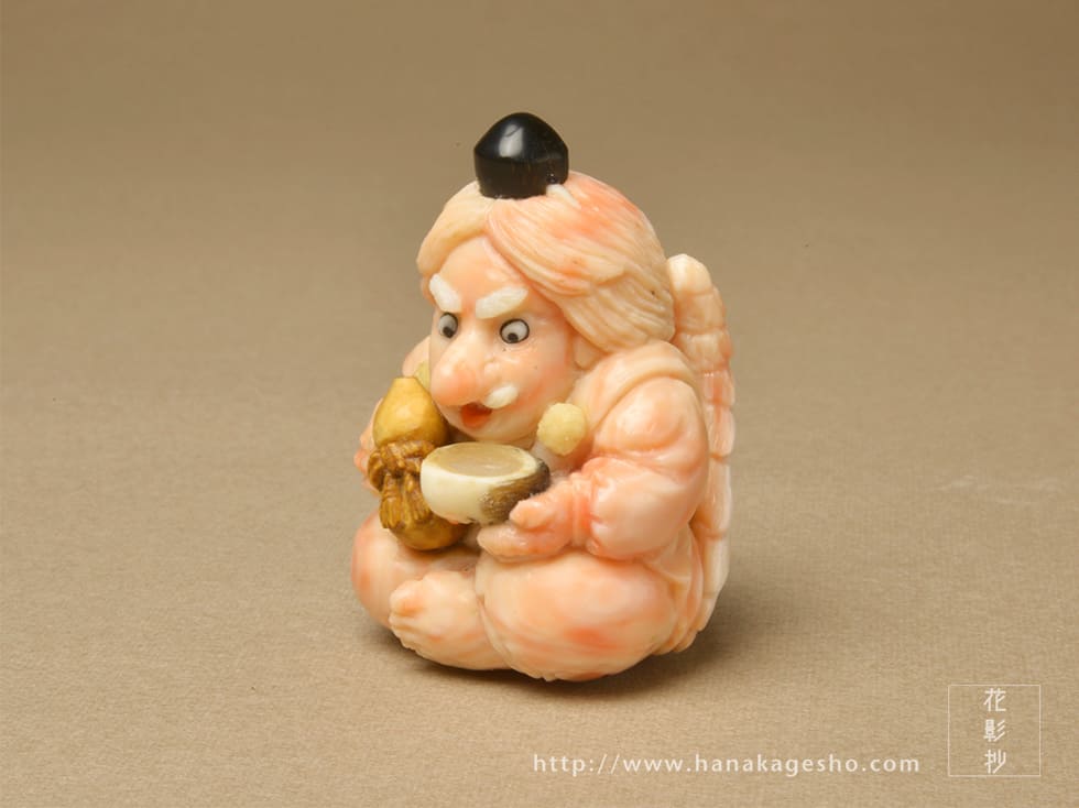 天狗の手には瓢箪、阿亀と、縁起の良いものを組み合わせて持たせています。