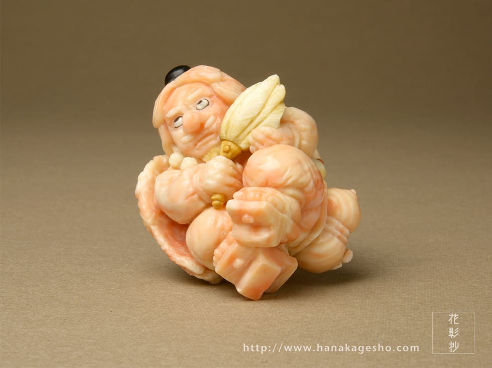 凄い力のあるアイテムをおっちょこちょいな天狗がついついうまい話に乗せられて渡してしまうのを、腰にぶら提げたお酒の入った瓢箪と阿亀の面根付でそれとなく表現しています。