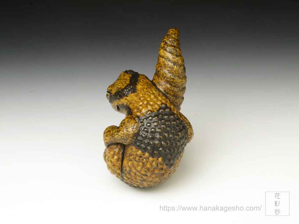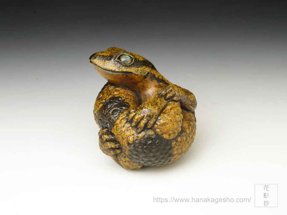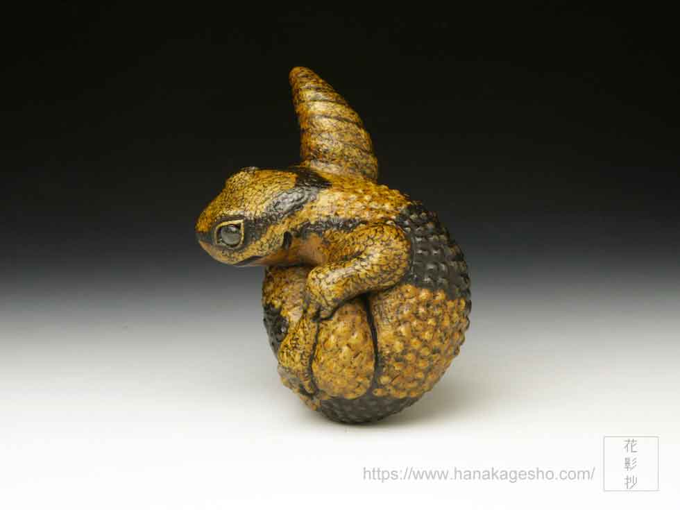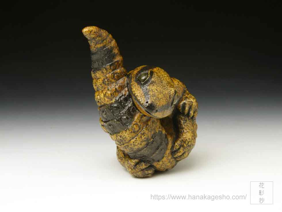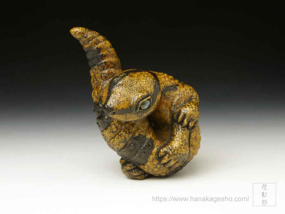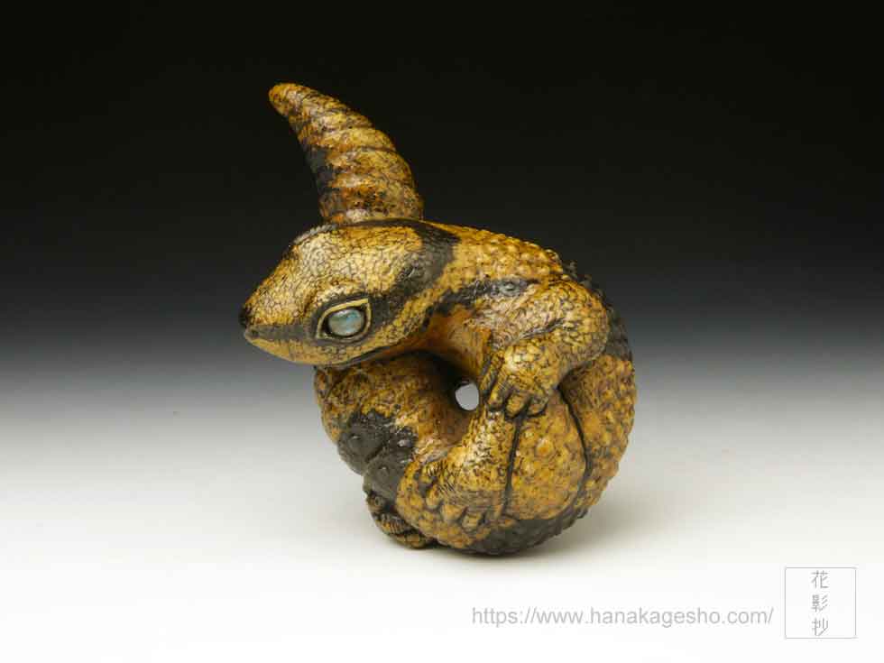 体の模様は矢車とお歯黒を幾度か染め重ね、瞳はラブラドライトを光の当たり方で色味が変化するように研磨し象嵌しています。