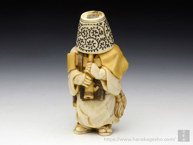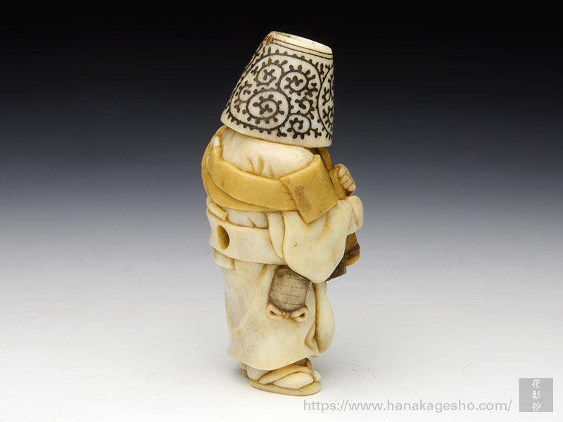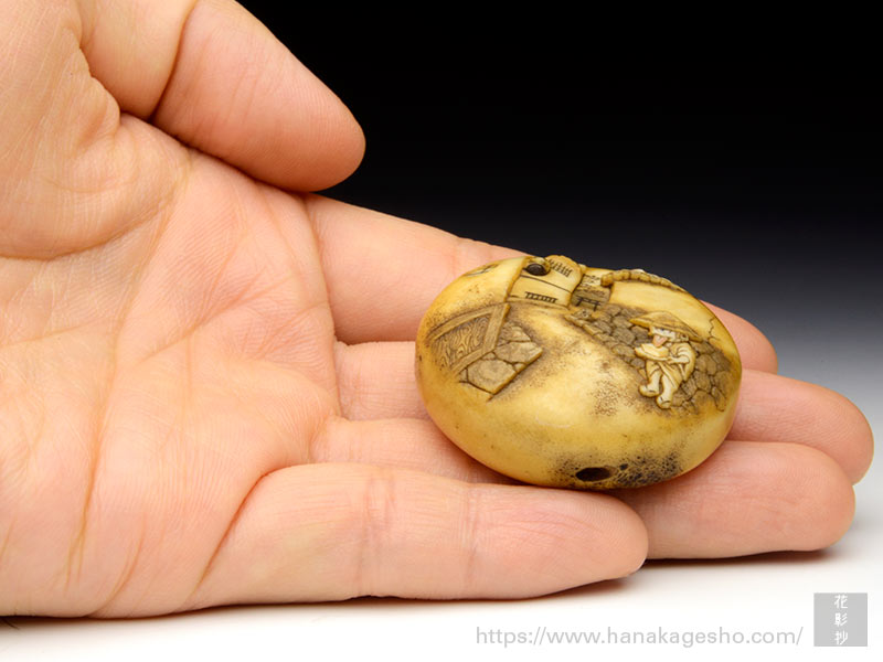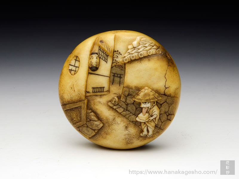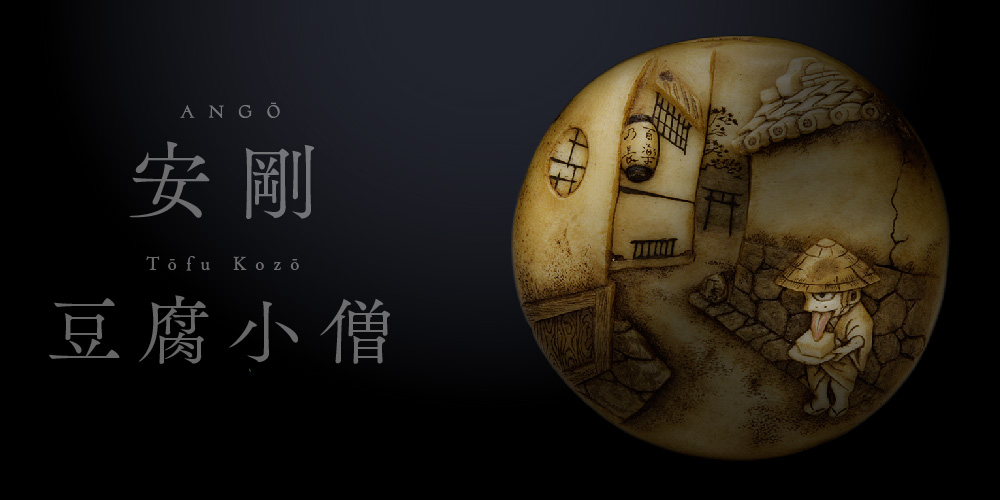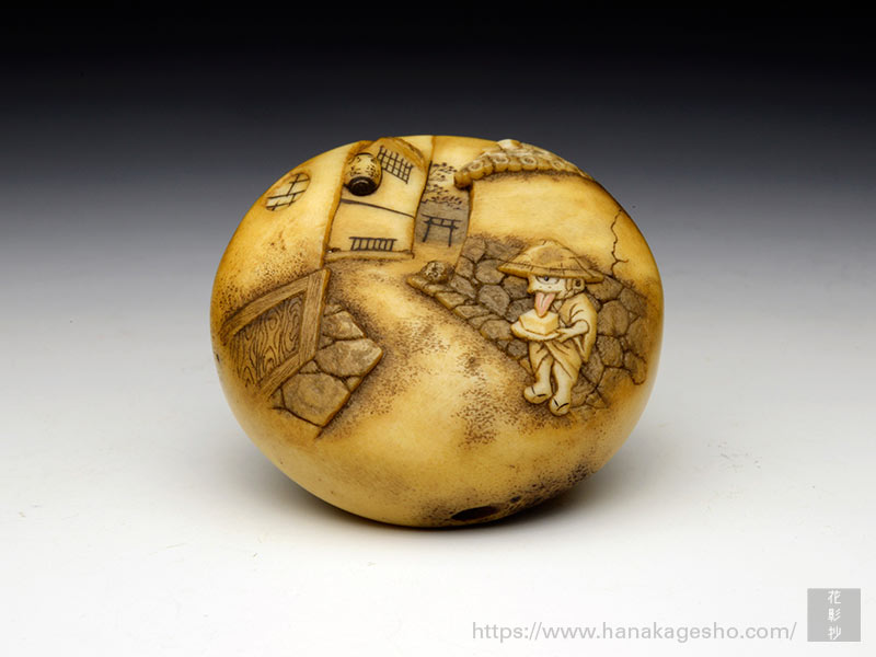 メインの参道につながる小さな路地。古い時代のそんな風景をバックに、豆腐小僧が1人たたずんでいる―という絵柄の饅頭根付。
