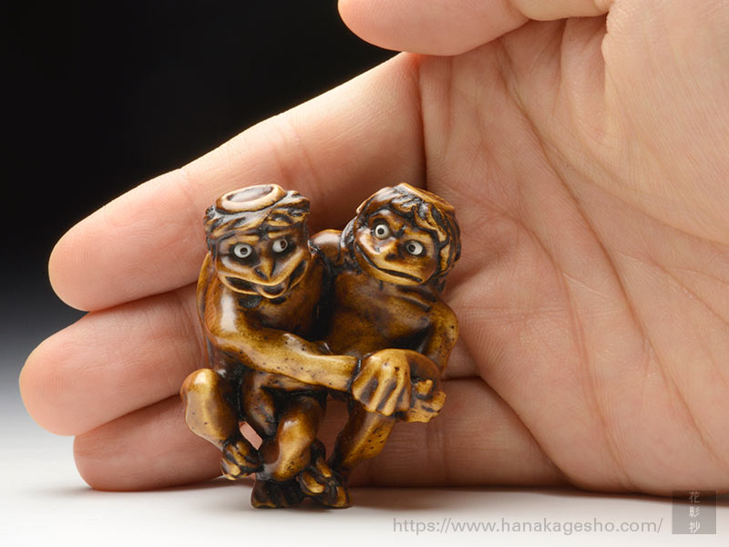 大きさ:4.6 × 3.8 × 3.8 cm 素材:黄楊 象嵌:河馬牙、黒檀、黒水牛角、漆