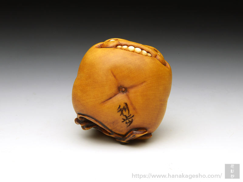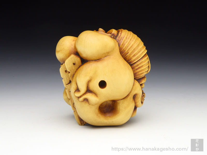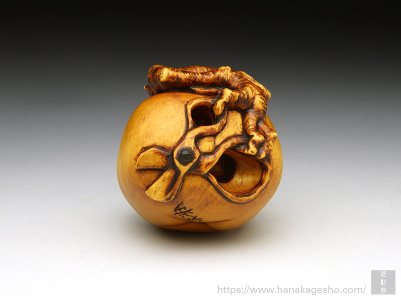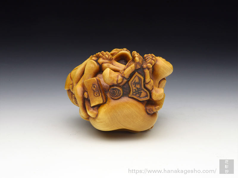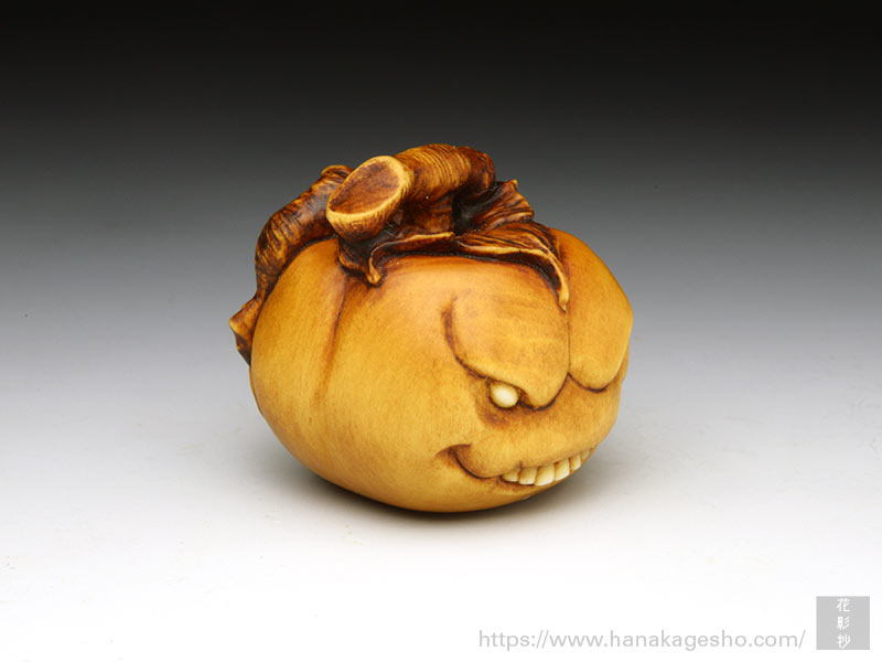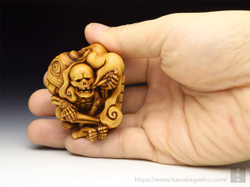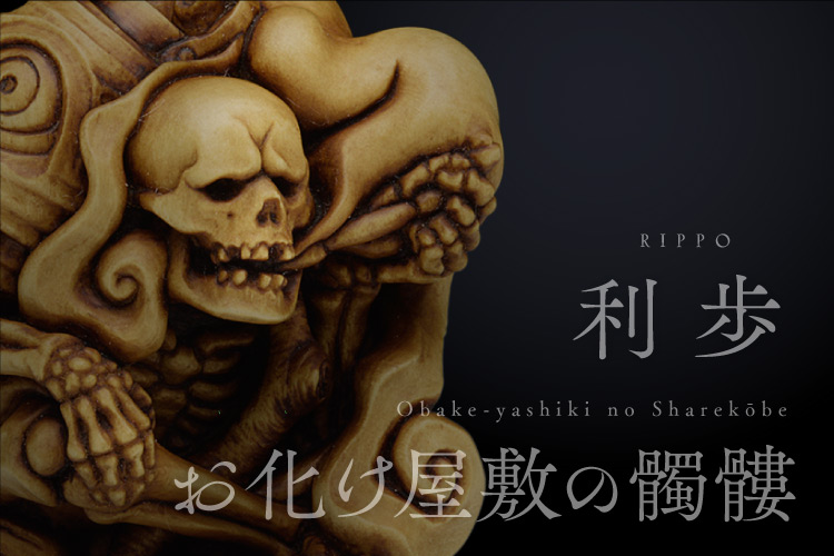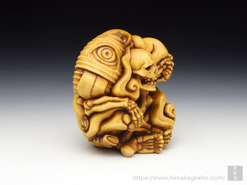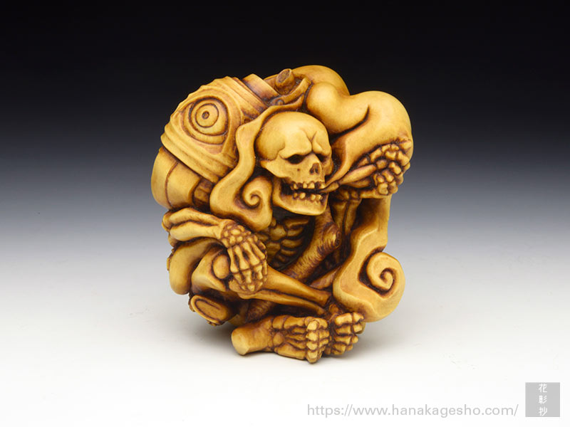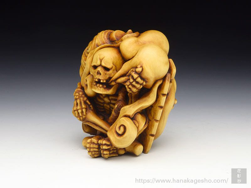 お化け屋敷の役者仕事で疲れてしまい休息中の髑髏の根付を制作しました。小道具の提灯お化けを肩に担いでおり、その後ろには本物のお化けが…という場面になっています。