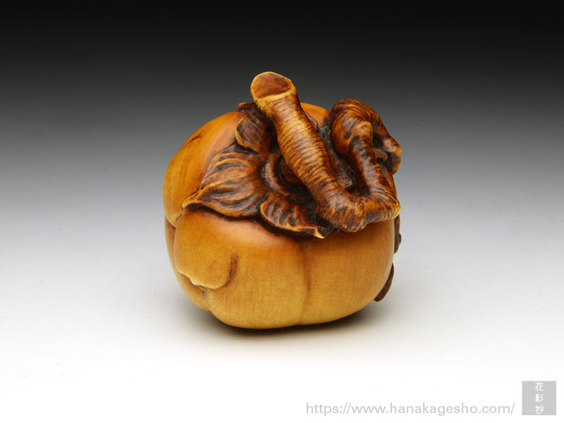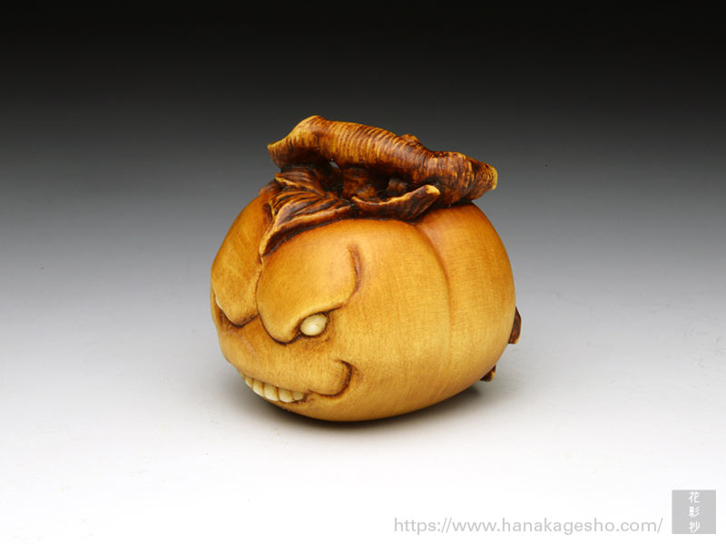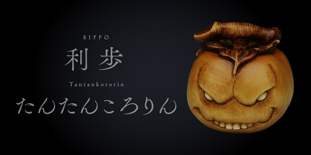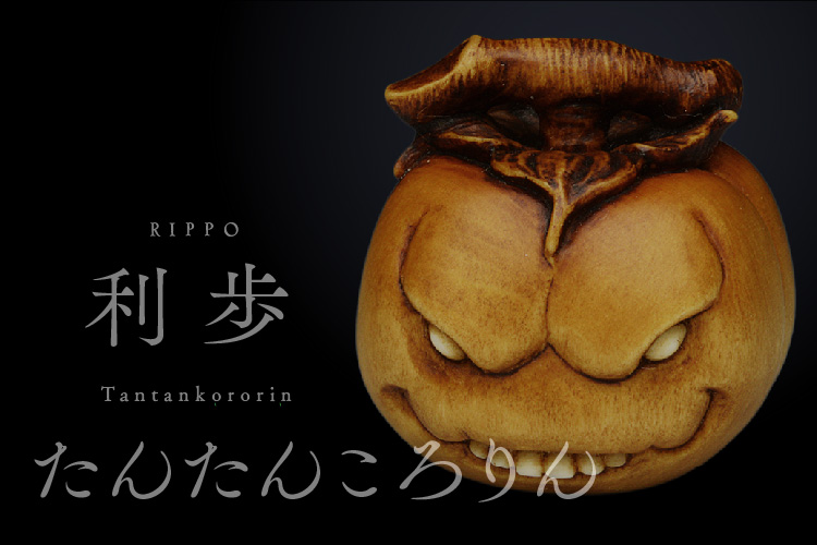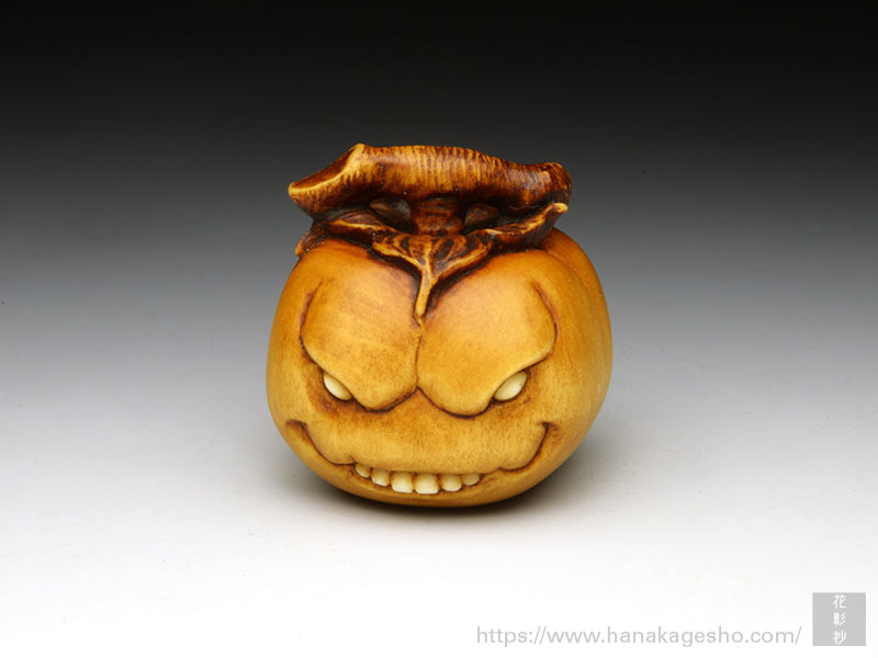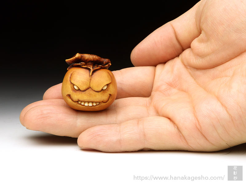 柿の実を採らずに放っておくと「たんたんころりん」という妖怪に化けるそうです。本来は穏やかな妖怪のようですが、今回は「柿の実を採らないと、村中の実を全て切り落としてしまうぞ」と背中のハサミを鳴らしている、少し意地悪な妖怪にアレンジして制作しました。作者の好みで、たんたんころりんの話の伝わる仙台の方でも良く作られている平核無柿をイメージして制作させていただきました。