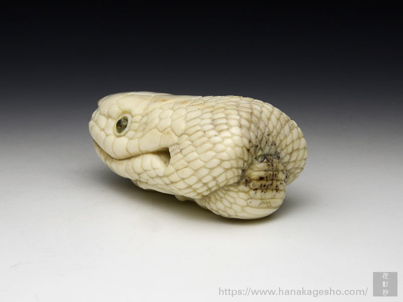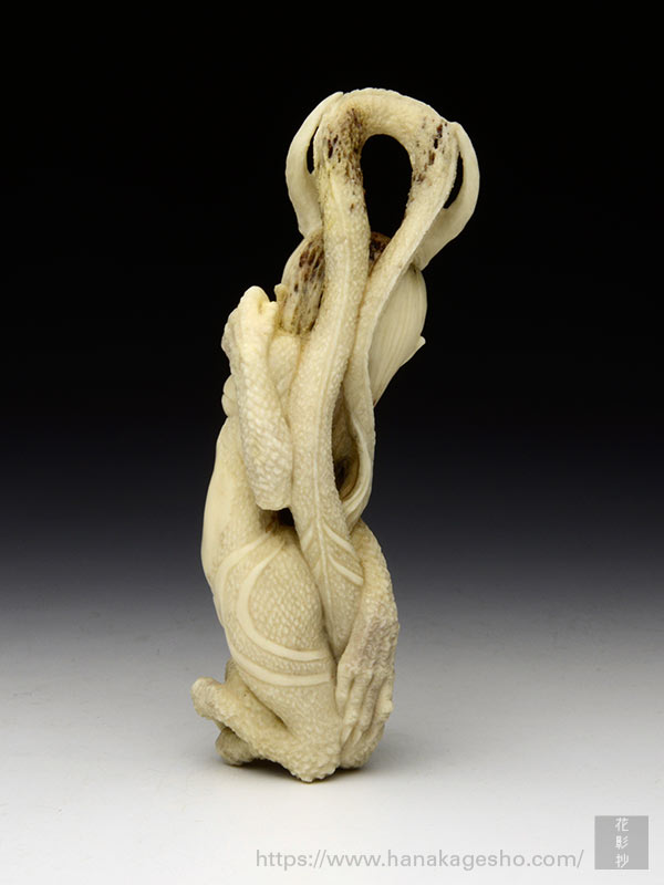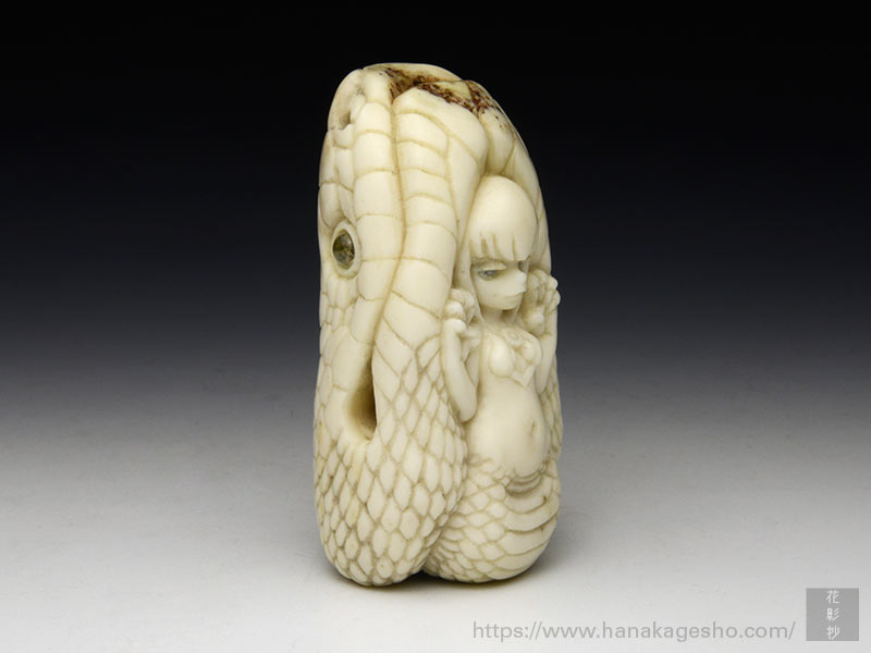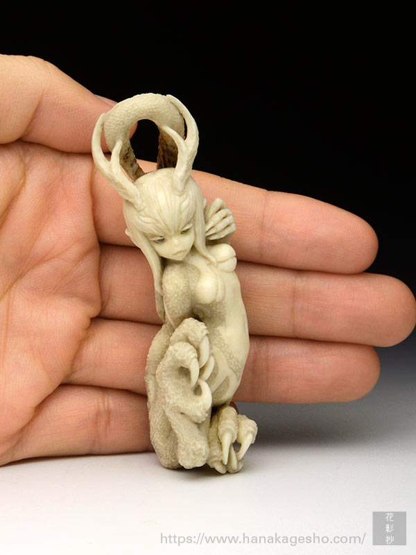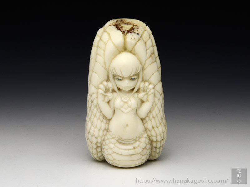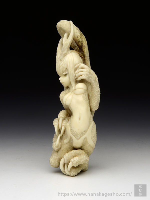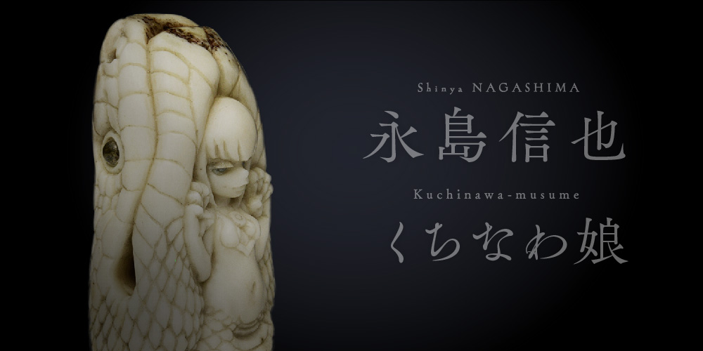 In his youth, Nagashima Shinya started with carvings of fishing lures, pokemon, and Izumo, a hometown myth. He then went on to netsuke and figurines. His predominant theme is attractive young girls.
