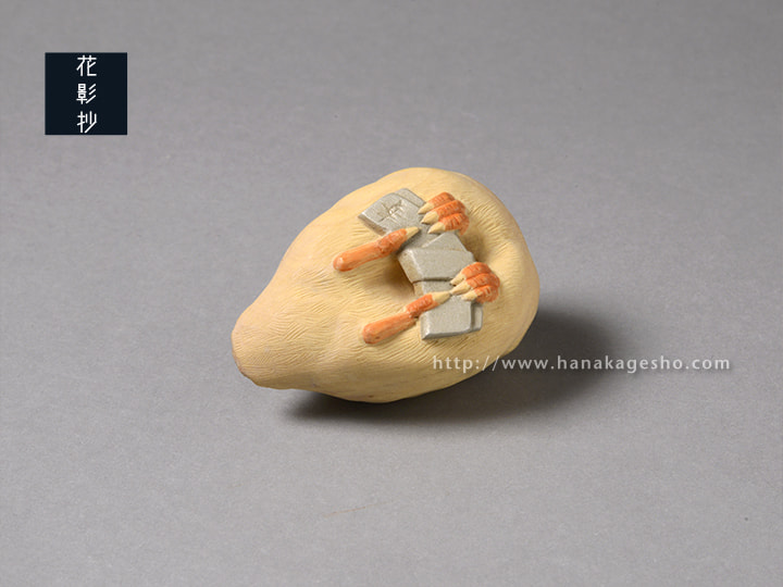 嘴と体表に漆彩色。裏の結び文の部分に銀粉(変色防止加工済みのもの)を使用。「木彫根付選集2025」にて発表。