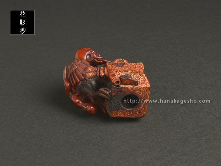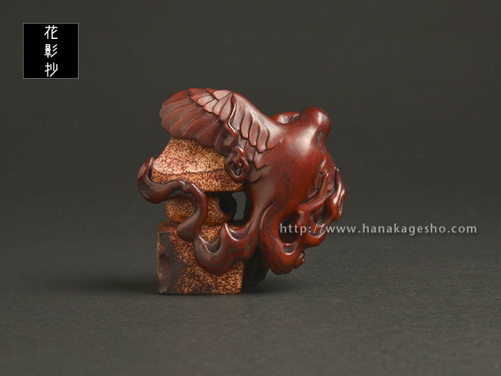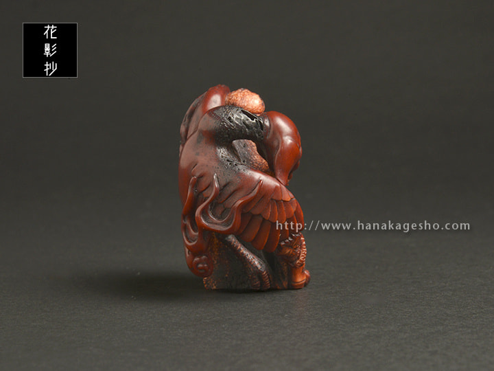 ふらり火という妖怪を鹿角で彫って、くちなしとインド茜で染め上げました。妖怪の細い足は内側に配置し、根付としての最低限の強度は保ったつもりです。(安剛)