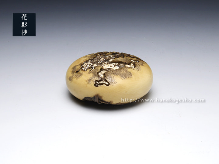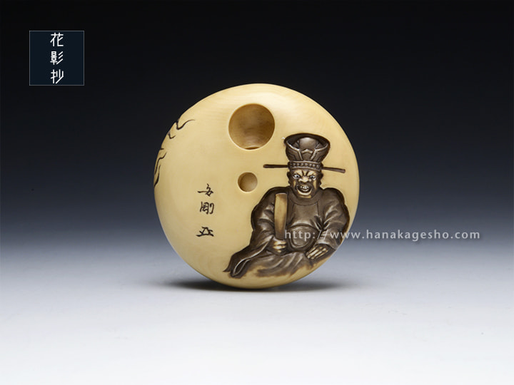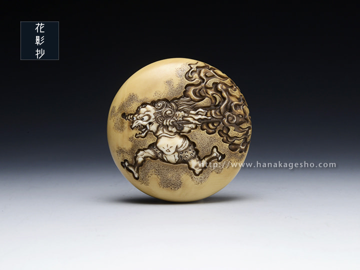 閻魔大王の命で、この世で悪行を働いた者を、火焔燃えさかる車を引いて迎えに来る鬼を、あるいは、この車自体を「火車」というそうです。『百怪図巻』という、江戸時代の絵巻の中の「火車」の図を、大いに参考にしました。(安剛)