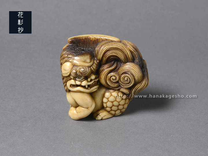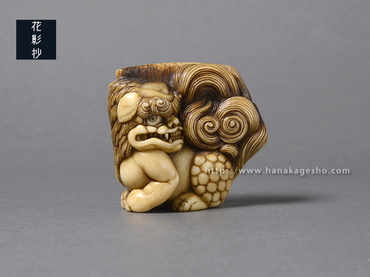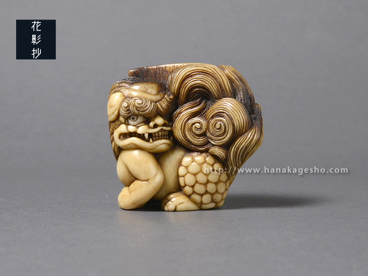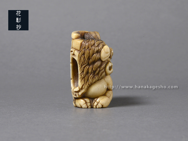 瓦片のような形状の中に、智慧の象徴である獅子(狛犬)が形彫りされています。端正な巻き毛ときりっとした顔立ちが印象的です。裏側には獅子を護る牡丹の花が咲きほころび、その傍らには文殊菩薩の梵字が添えられています。中央の紐穴左脇の一段奥まった箇所に隠れているのは、「福」の金文。小ぶりでまろやかな湾曲と適度な膨らみがあるため握り心地も良く、御守りのようにお持ちいただける根付だと思います。