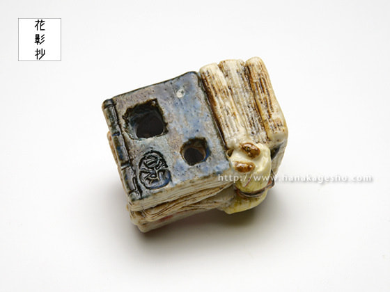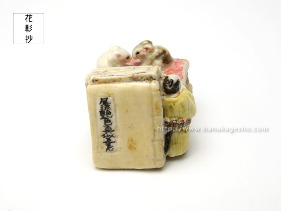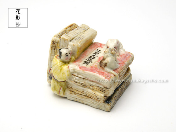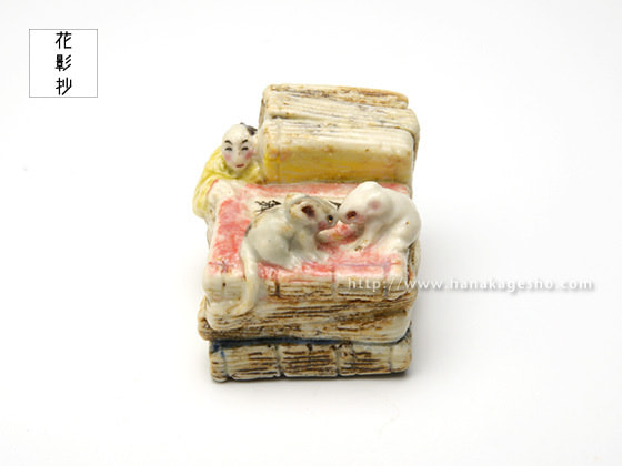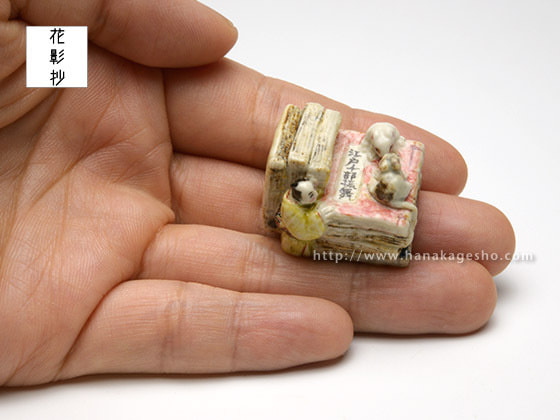 「『艶色風流真似ゑもん』より、真似ゑもんの登場です。仙女から妙薬を貰い、豆粒大の小人になった真似ゑもん、色道修行に出かけ、あちらこちらで現場や出来事を見物します。今回は貸本屋の本の陰でネズミ達の逢瀬を覗いています。ちなみにフランス語で“本の虫”の事を“図書館のねずみ”と言います」(泉水)