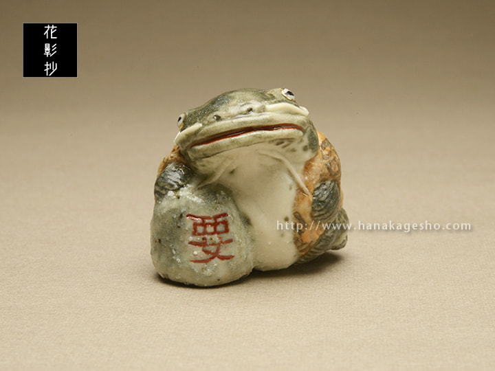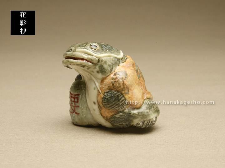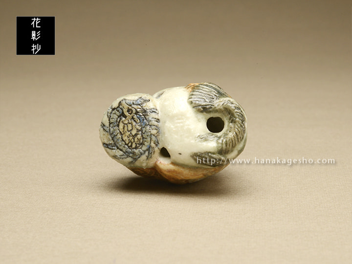 古くは地震を起こすのは、日本列島の下に横たわる、あるいは取り囲む龍・蛇(=地震蟲)の仕業と考えられていましたが、江戸時代にはすでに鯰にとってかわっていた様です。そもそも大地震の前に鯰が騒いだ、という伝承は様々な場所にあり、地震を予知してくれた鯰がいつの間にか地震を引き起こす悪者になってしまいました。安政の大地震後、要石が鯰を押さえつけている「鯰絵」やお札が大流行し、鯰が地震を起こす、という俗説は定着してしまったようです。「雨には困り〼(マス)野じゅく暫(シバラク)のそとね」は鯰絵の一つで、歌舞伎『暫』のセリフ「しばらくのつらね」をもじったものです。安政の大地震の被害で家屋が倒壊し、しばらくは野宿を強いられるという状況を伝えています。こちらの根付の鯰はやっつけられているばかりではなく、「本当の犯人」である「地震蟲」を要石で押さえつけ、「やれやれ」の表情です。着ている半纏は『暫』のアイコンにもなっている市川家の定紋「三升」です。(泉水)