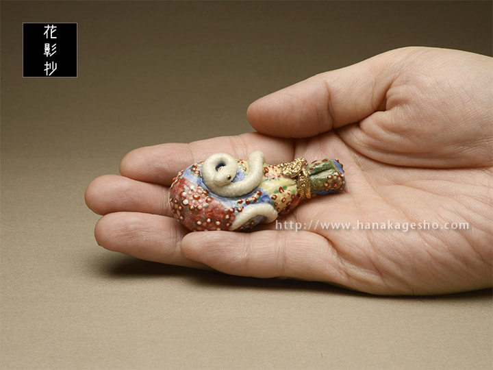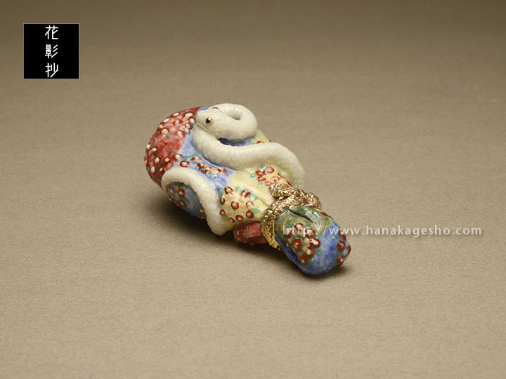 ヘビを神の使い、屋敷の守り神とする地域は多く、ヘビ(特に白ヘビ)を飼うと富むと言われ、また、弁天様のお使い、毘沙門さんのお使い、青大将はお諏訪様のお使い、と神聖化され、殺したり虐めたりすると罰が当たるとされます。弁天様は白ヘビの化身、白ヘビは弁天様の化身とされることもあります。北斎の「琵琶に白蛇図」を根付にしました。