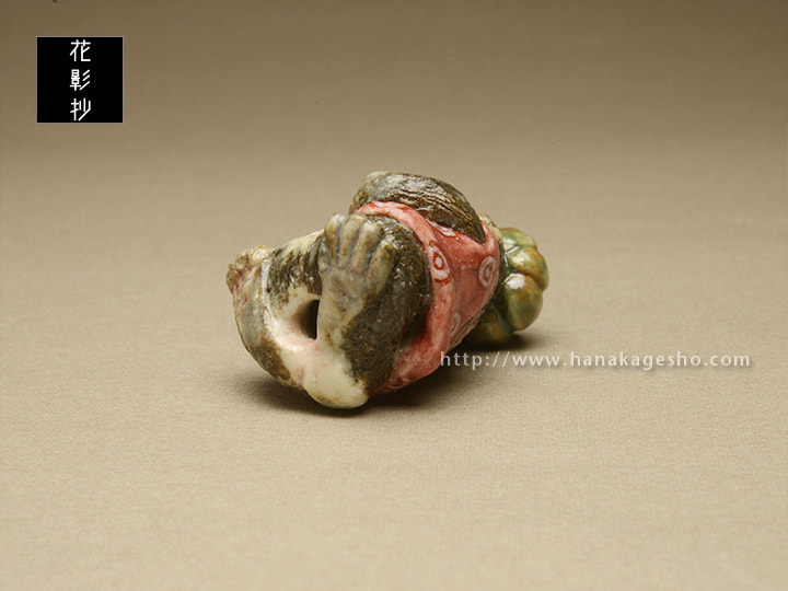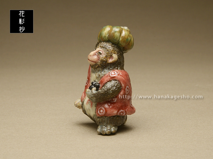 サルという言葉は「去る」に通ずるとして忌詞とすることが多く、特に一日の運勢を決定する朝の間には嫌いました。いろいろな代用の言葉トッツァ、ヤマノオッサン、ヤマノジイサン、キムラサン(気分がむらな気分屋だから油断できない)のほか、サルを祝い直して「得手吉」「得手公」と呼びました。逆に「難が去る」として魔除けにすることもあるようです。朝、サルと誤って言ってしまった場合「クロマメナンキン」と唱えればよい、あるいは「イヌ」と言い返せばよいとか。あらかじめ黒豆と南京を持って現れたエテキチ君です。(泉水)