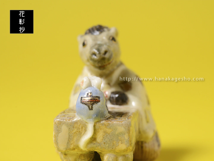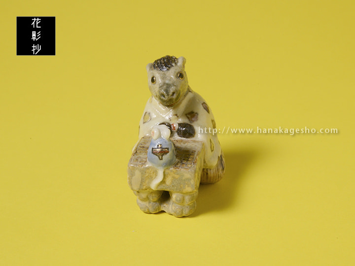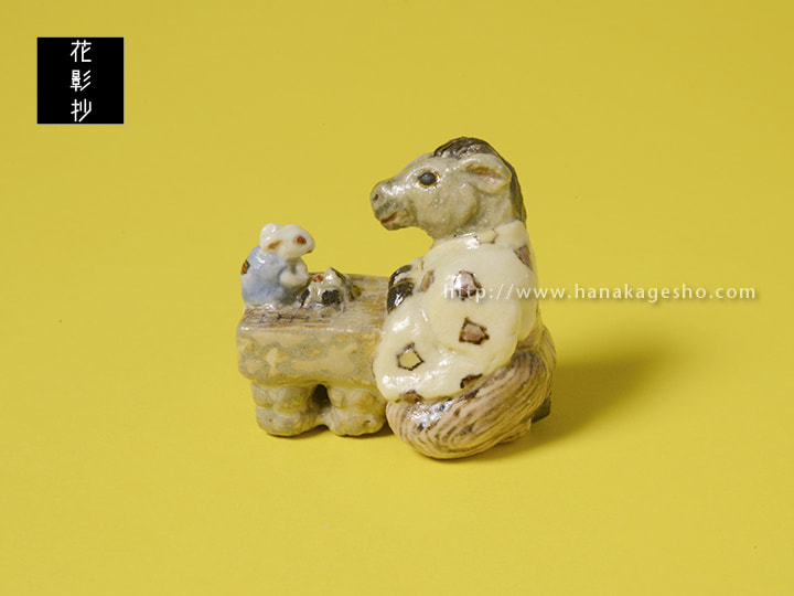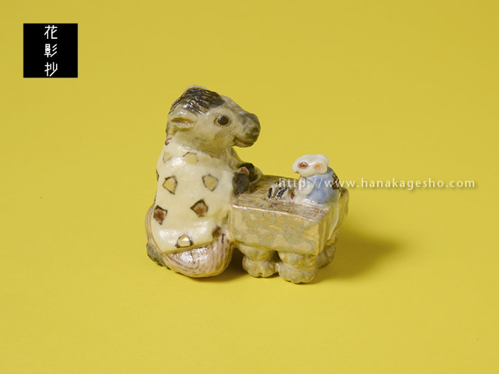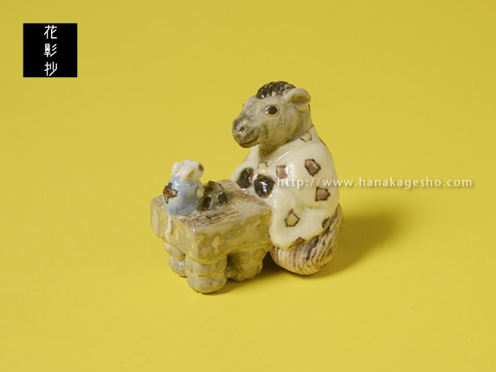 囲碁や将棋も代表的な暇の過ごし方。仔馬が独楽ねずみ(独楽柄の半纏を着ています)と将棋の駒で遊んでいます。来年は午年、向かい干支は子年です。(泉水)