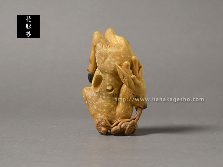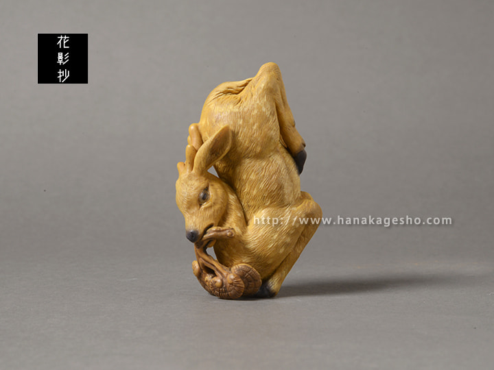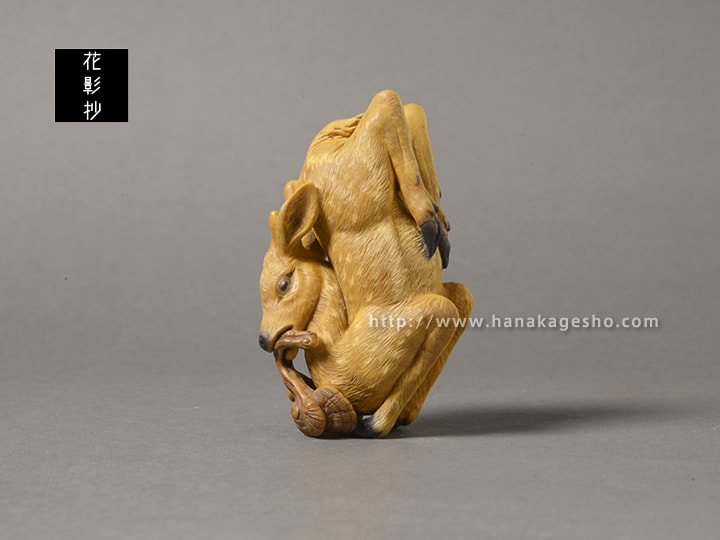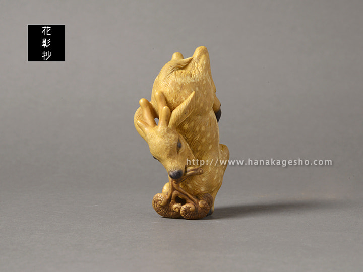 鹿が霊芝を咥える図(鹿献芝)は、中国の伝統的な題材であり、木彫や玉彫、絵画などにおいてよく見られます。