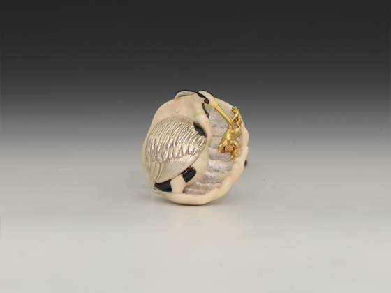 今回は「ピルエット」というモンブランの万年筆に合わせた根付と万年筆ケースのセットを、というご注文を頂きました。「ピルエット」という のは、バレエの踊りの型で、くるくると廻る様子だそうです。それをモチーフにした「ピルエット」は円をいくつも重ねたような模様でまるで水面に水滴をたらした時の波紋のようです。そんなイメージもあって、今回は「神の雫」という題名をつけました。ピルエットは万年筆ですが、その優美なデザインや貴石を用いているところから宝飾品にも例えられるとの事で、それほどに美しい万年筆に合わせる根付を、という今回のご注文は、大変難しかったです。素材は銀や真鍮などの金属素材を多く用い、アメジストや真珠も使い万年筆と素材感を合わせて、モチーフは鷺、と和風の味を加えて和洋折衷のような不思議な雰囲気を目指しました。そして、製作した根付と「ピルエット」の間を取り持つような万年筆ケースをイメージしてケースのデザインをし、それを丹羽レザースさんに製作して頂きました。革小物というものは、毎日触れて使われるものなので、まず一番は使い勝手の良い事。そして革という性質上、なるべく変形しないようにする事。そういった点を丹羽さんにご教授頂き、打ち合わせを重ねデザインを何度か変更。出来上がったケースはとても洗練されて、使い勝手も良く、そしてきれいな形で長く持ち続けられる。「丹羽さんのとても丁寧な仕事が感じられる万年筆ケースに私のデザインがのっている」出来上がった万年筆ケースを手に取った時、そんな嬉しさがありました。(かぶ)