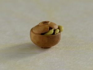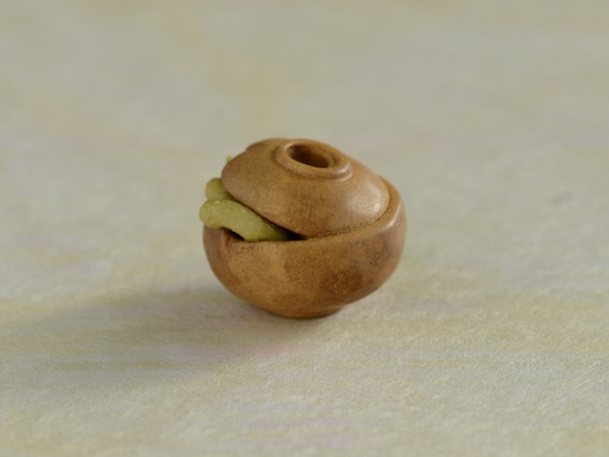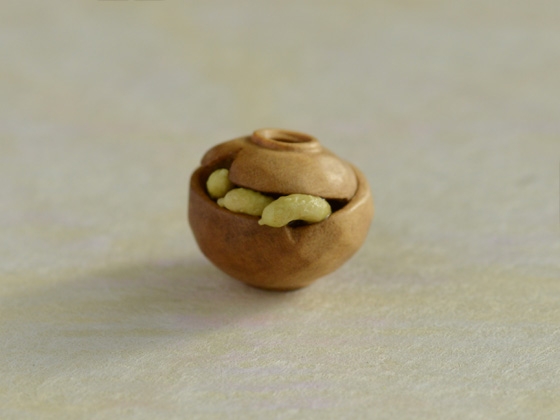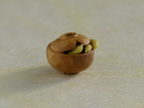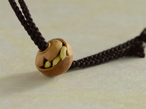 河童の根付に合わせる緒締として注文を受けて制作しました。古くから伝わる椀を貸してくれるという伝説を持つ淵の「椀貸淵」という話がもとになっています。地方によって諸説あるようですが、河童から借りたお椀を欠けさせてしまい、村人がお詫びに胡瓜をいれて返そうとしている様を表しています。