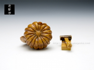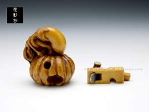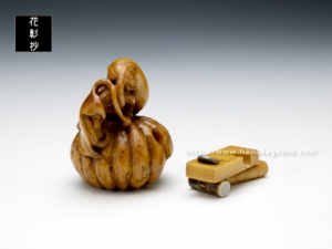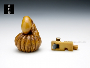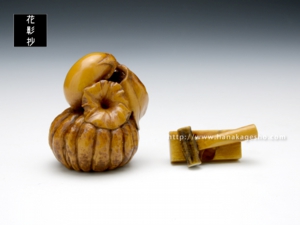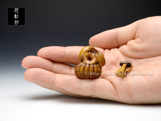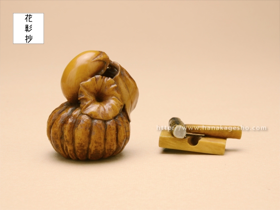 「茄子と南瓜」という端唄に出てくる物語をテーマとして根付と緒締を制作。緒締の金槌と鉋は大工という言葉が出てくるのでその象徴として組み合わせています。