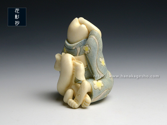 ある暑い日の夕方、猫又が縁側で夕涼み。あれ? ふと気づくと顔を洗っていました。白雨が降るのかしらね…庇の向こうに目をやる猫又。そんな情景を根付にしてみました。猫又の着ている浴衣にはマタタビの花をあしらいました。マタタビは別名、夏梅とも言うそうです。
