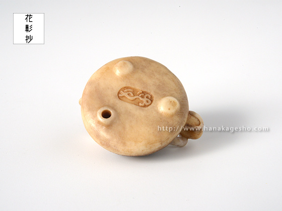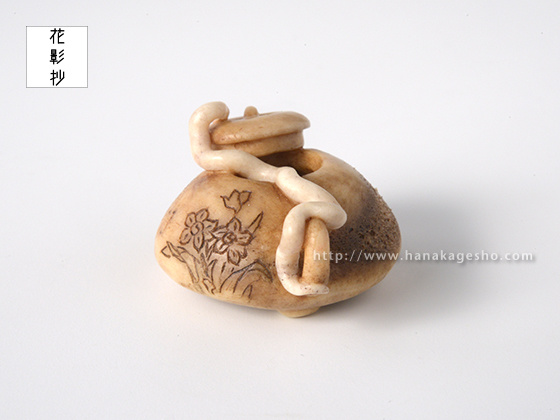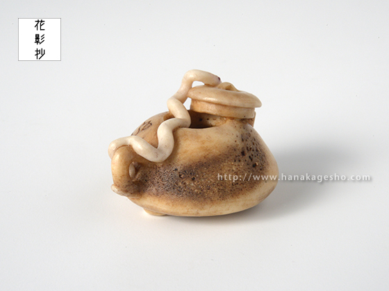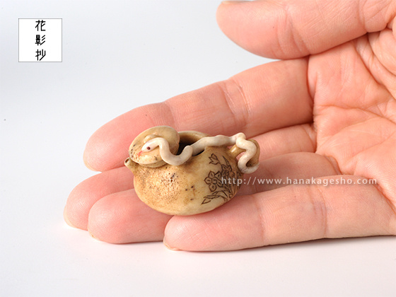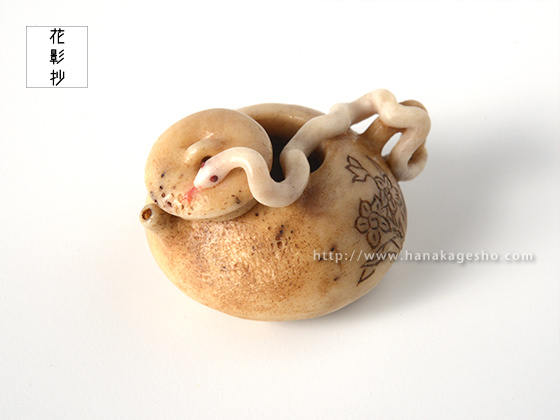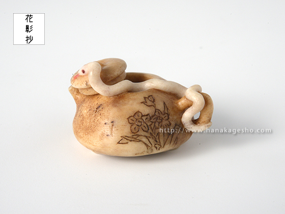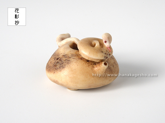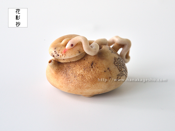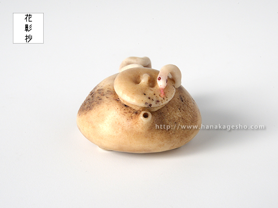 夢で見るととても縁起が良いといわれる白蛇は、水神のつかいともいわれています。水に関連する物、なおかつ縁起の良いものを組み合わせた根付にしました。