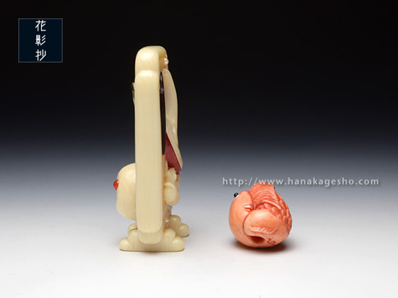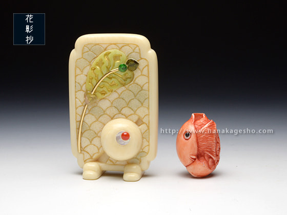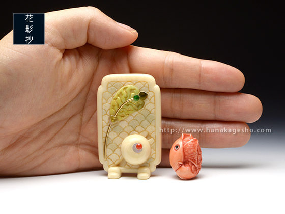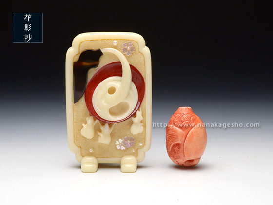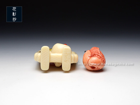 根付:象牙、漆、藍 象嵌:べっ甲、白蝶貝、真珠、半貴石、K18、金泥、珊瑚