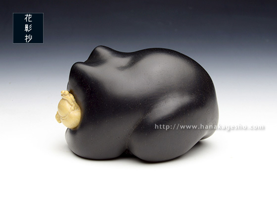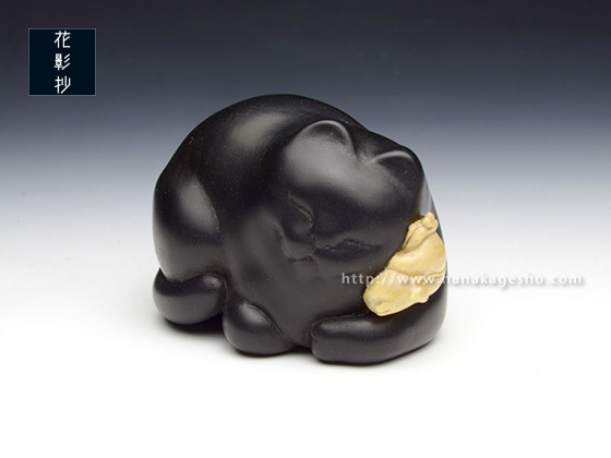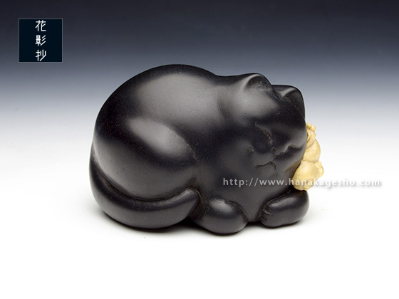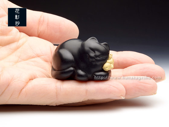 福々しい猫が、ねずみの飾りの付いたふっくりしたがま口を抱えて満足そうに寝ています。(かぶ)
