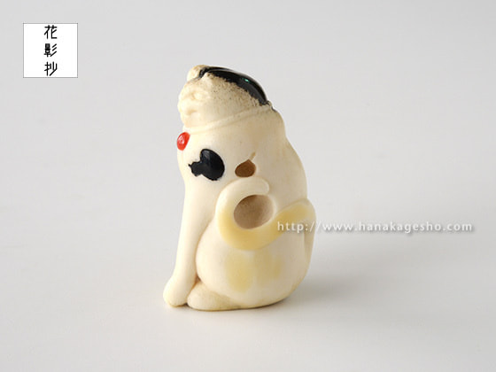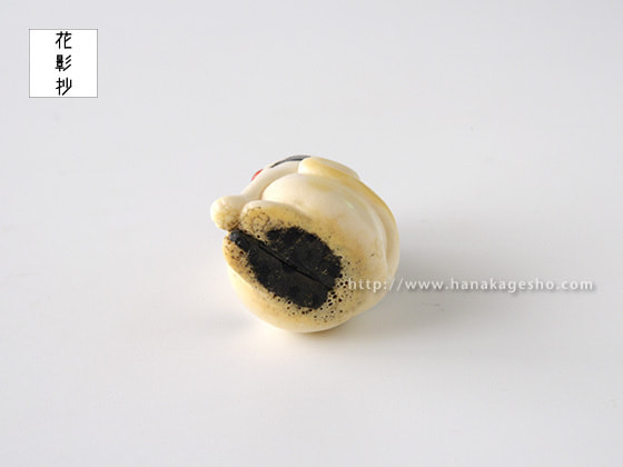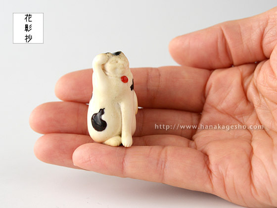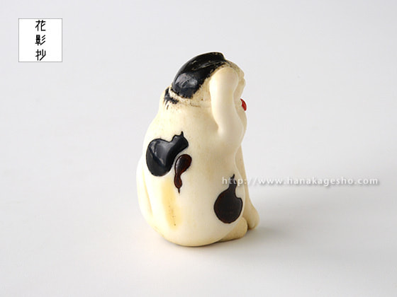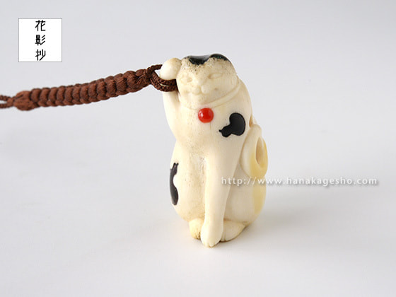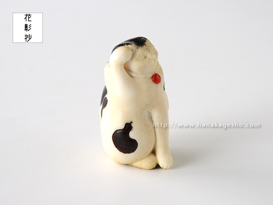 「一猫(びょう)+五ひょうたん=むびょう。飼っている猫ちゃんにも飼い主様にも猫好きの方にむびょう息災の意味を込めて作りました。ひょうたんのひとつは根付用の紐穴になっていて、提げても根付としてもお使いいただけます。猫の模様に漆を使ってます」(かぶ)