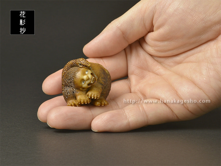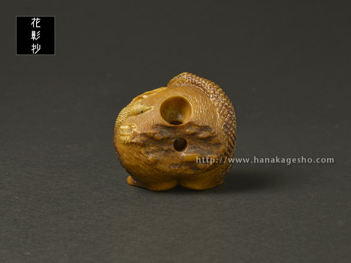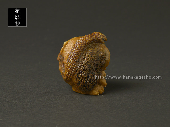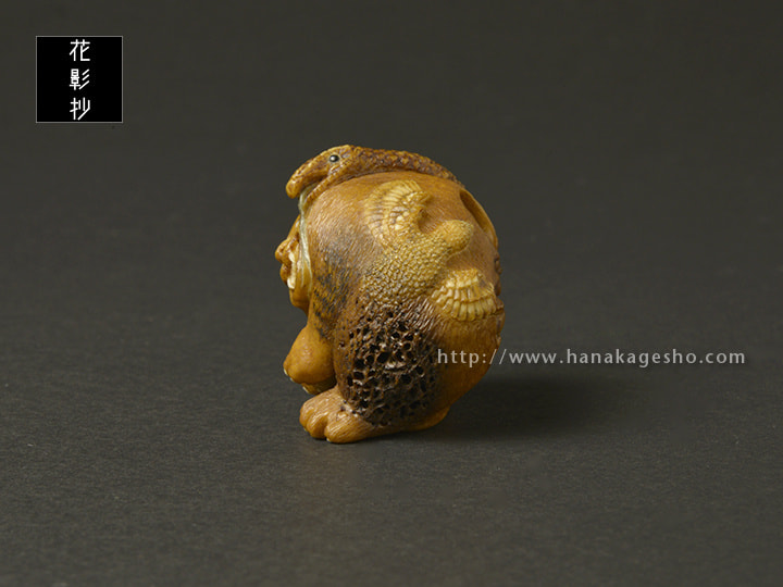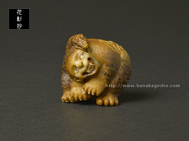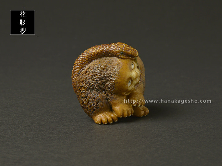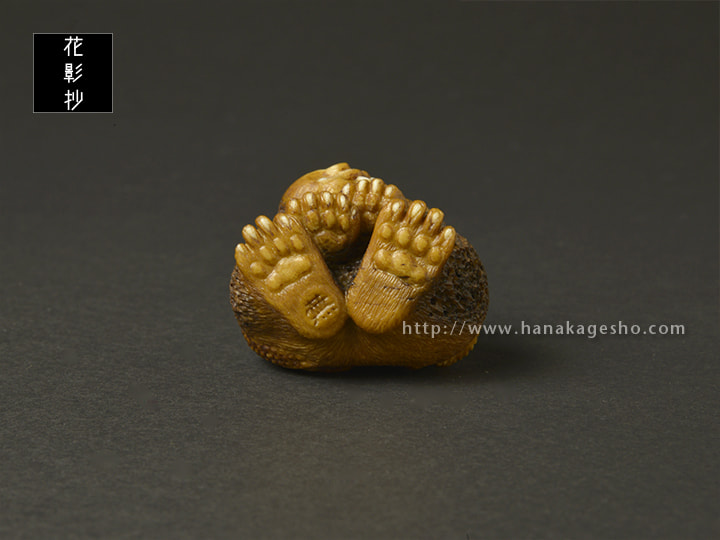鵺はトラツグミの不気味な鳴き声から想像された化け物とされています。でも、実際はどのような悪さをしていたのでしょう。私の想像する鵺は可愛らしく、“トラツグミさん鳴いてるね”、と尻尾のへびさんとお喋りしています。森の奥深くにひっそりと住んでいる「ぬえ」の姿を根付にしました。 (かぶ)