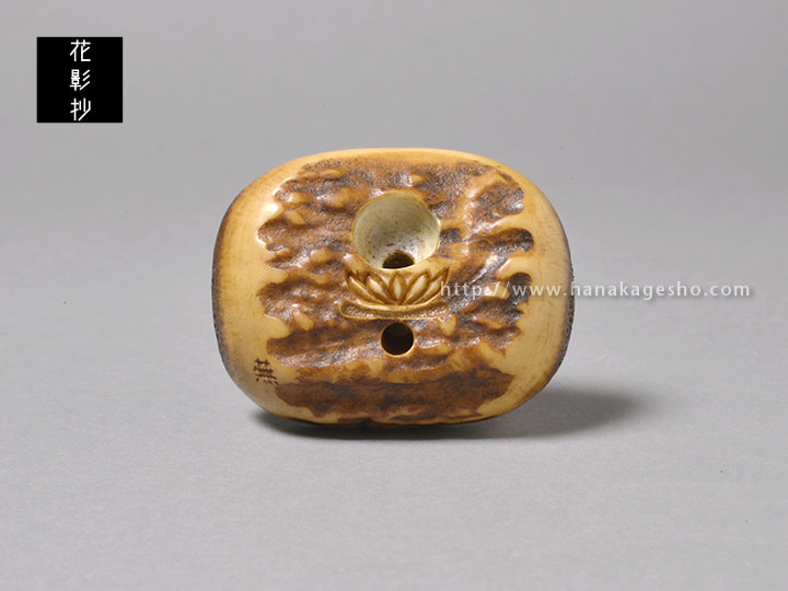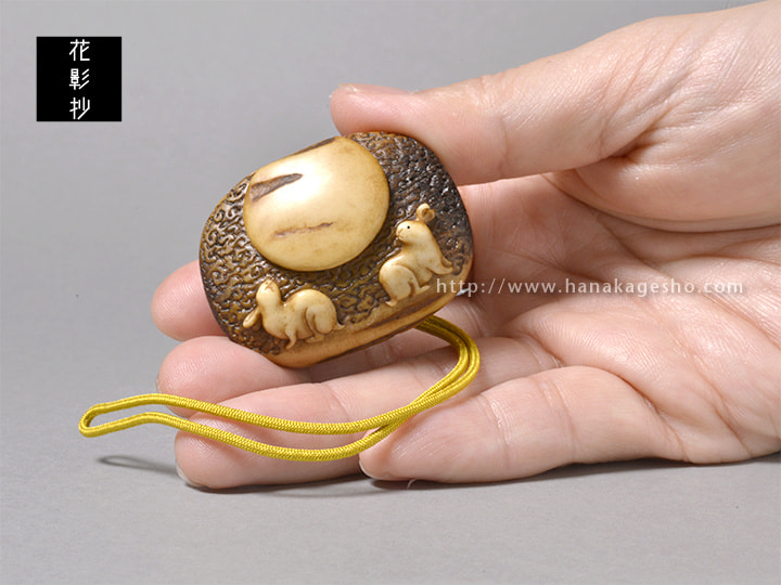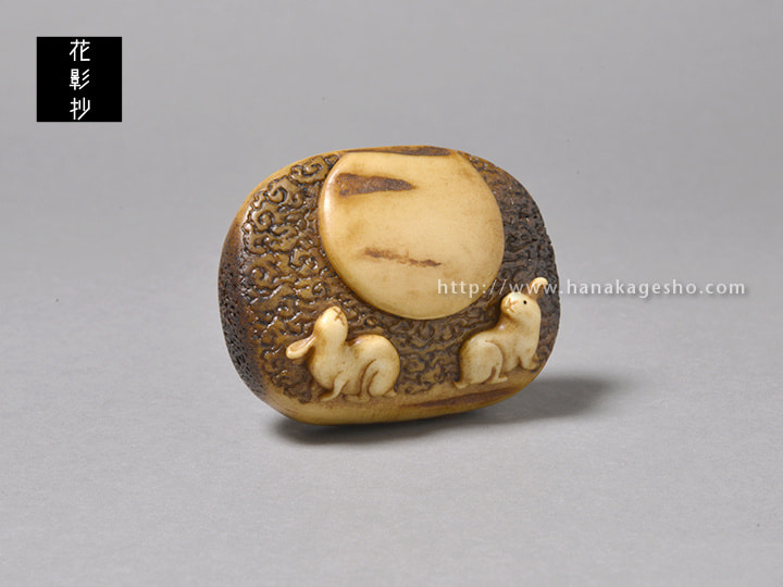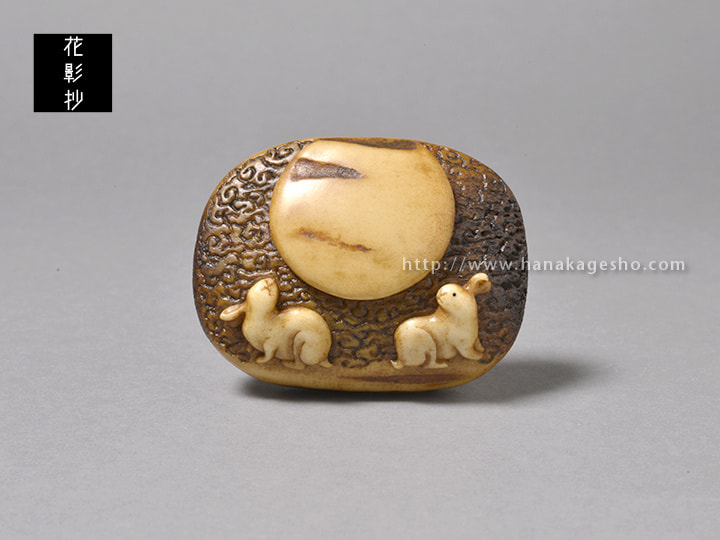 月待信仰という言葉から発想して図案を考えました。十五夜、十九夜、二十三夜など特定の月齢の夜に集まるという行事だそうです。月の夜に集まるという行為がとても神秘的に思え作ってみたいと思いました。兎の姿は東京国立博物館で開催されていた大覚寺展での腰障子に描かれた兎を参考にしています。紐穴を月に見立て蓮と組み合わせて月輪の図にしました。(蕪)