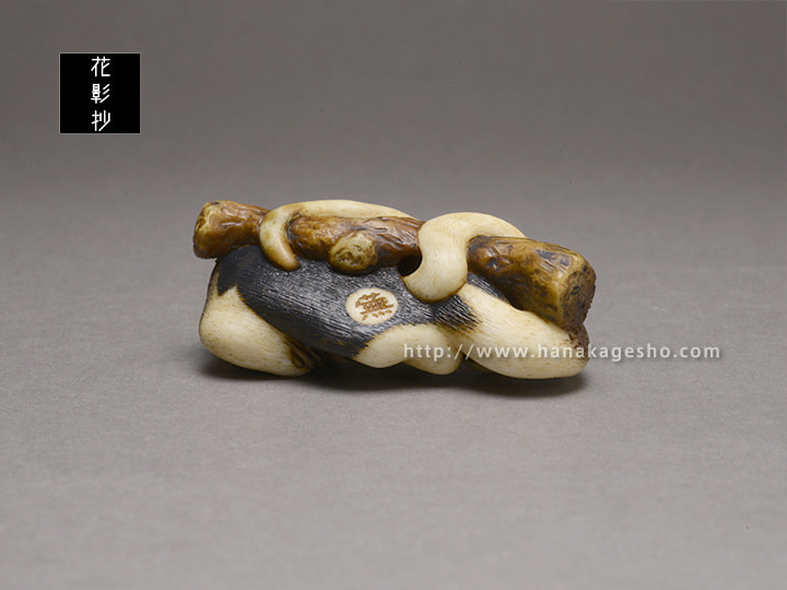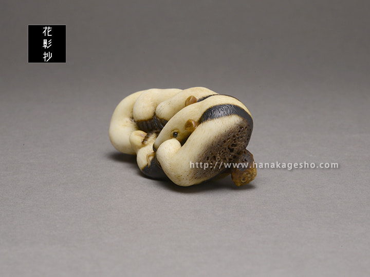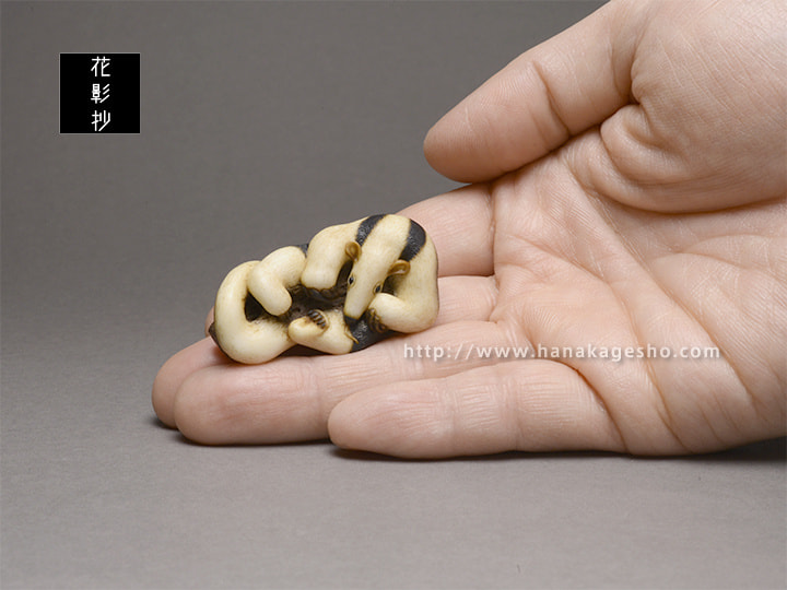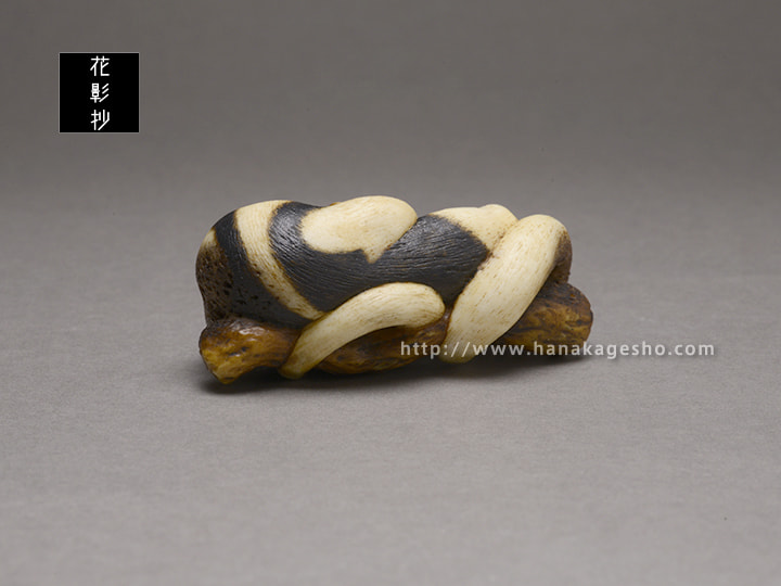 最近とても気になっている、ミナミコアリクイを根付にしました。ミナミコアリクイはとても尻尾の力が強いようで尻尾で体重を支えられるので、根付としてどのような姿にしようかと考えて、木に尻尾を絡みつけてぐっと身体を持ち上げている姿にしてみました。(蕪)