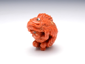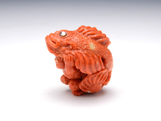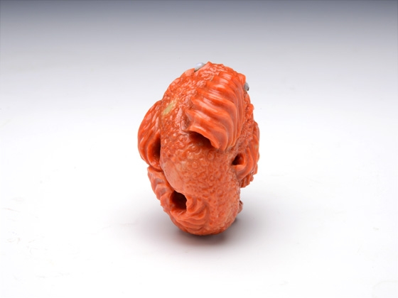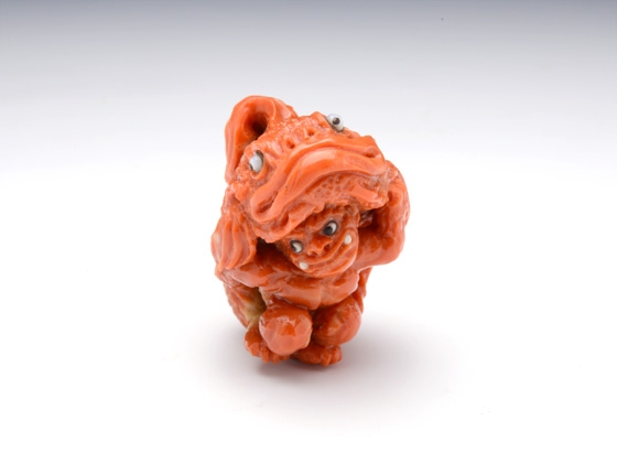 「子鬼が笠の代わりに読んで字の如く"鬼"、"笠"、"子"、鬼笠子!を被って鍾馗様を威嚇しています。 普段は鬼だけなら鍾馗様の方が圧倒的に優位なのですが、巨大で険しい顔をした鬼笠子を前にたじたじになってしまっています。 子鬼もここぞとばかりに鍾馗様に鬼笠子をみせつけている様子を表現しました。 古典の根付では子鬼が笠を被って鍾馗様から隠れる図案が多いですが、海の魚"鬼笠子"の名前を見て、この根付を思い付き制作しました。(森謙次)