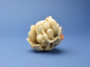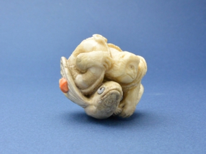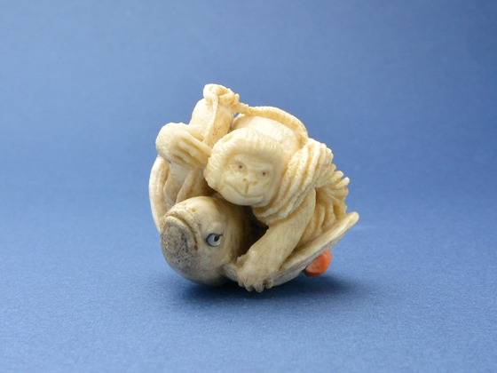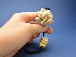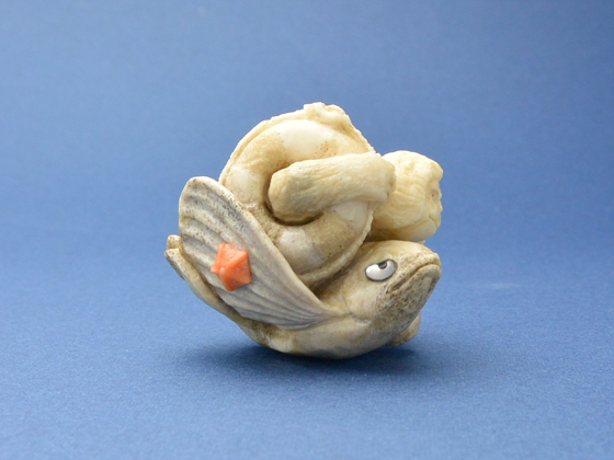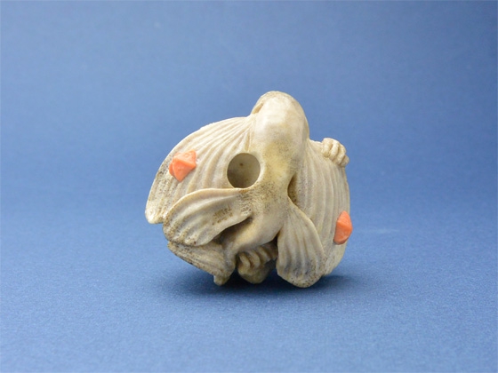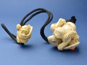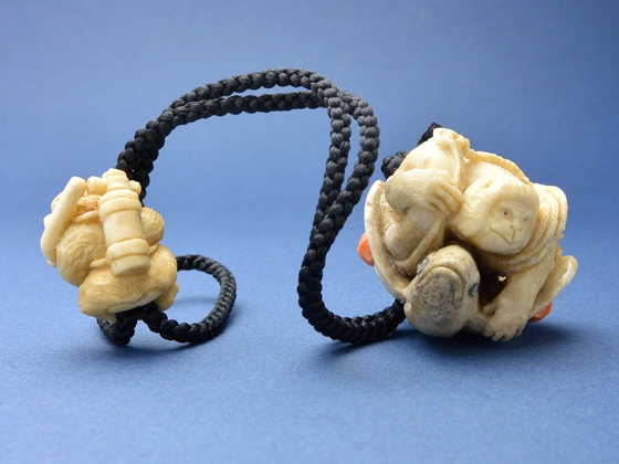根付/ヘラ鹿角、べっ甲(猿の眼・トビウオの目)、白蝶貝(トビウオの目)、緒締/鯨歯、べっ甲