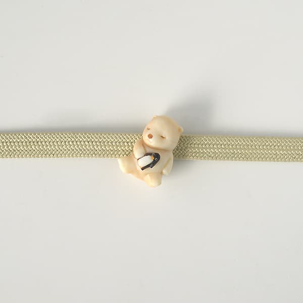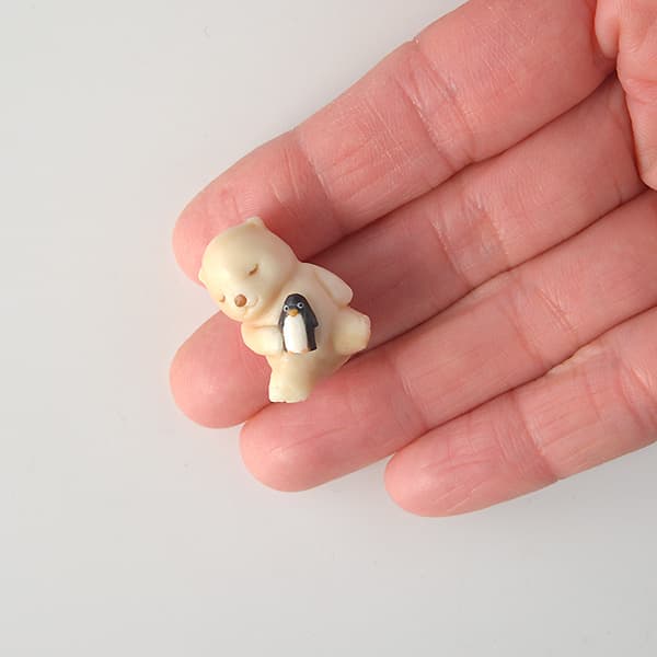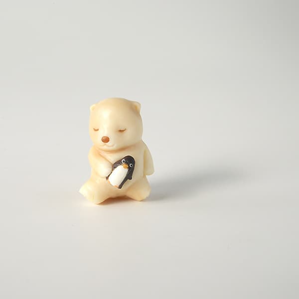 シロクマの子どもがペンギンのぬいぐるみを持ってお昼寝をしている図。(森謙次)