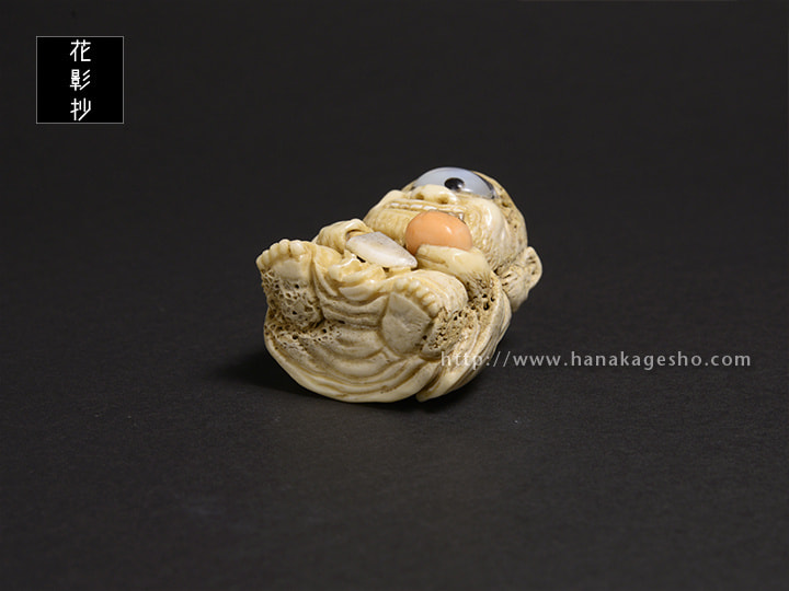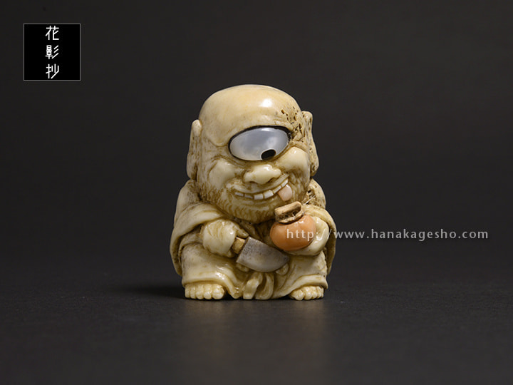 未熟なお坊さんが妖怪になったといわれる青坊主。成熟した柿を食べて何とか成長したいと思う前向きな根付です。(森謙次
