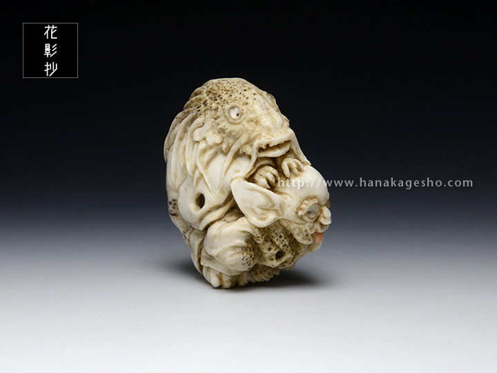 鹿角 象嵌:水晶、猪牙、水牛角(目)・珊瑚(舌)