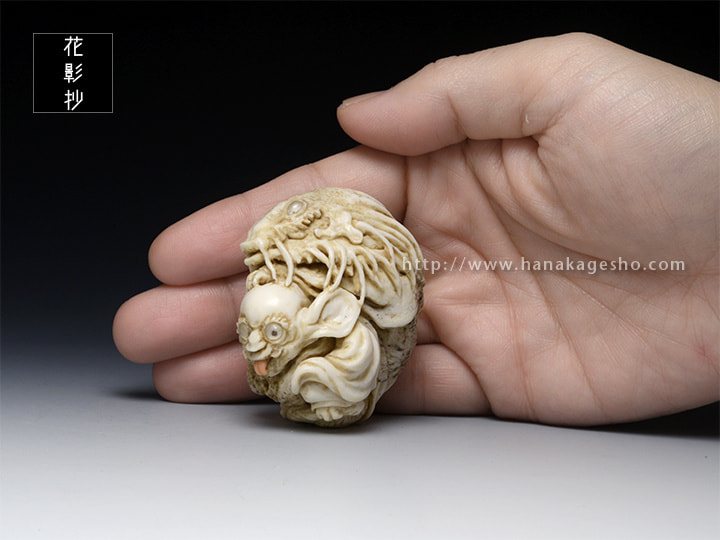 幕末の絵師・高井鴻山の《七妖怪図》に描かれた二妖怪をもとにした根付。この根付を作っているとき、ヤドカリとイソギンチャクの共生のことを考えていました。それぞれ違う強みや弱みを持つ生き物が、互いに補い合って生きる姿っていいなと。(森謙次)