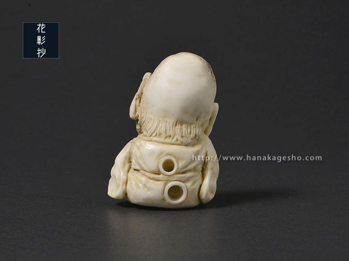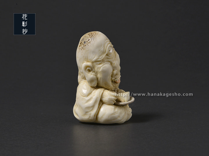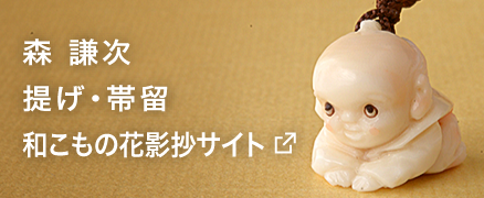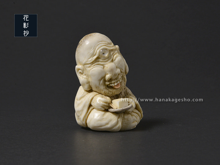 大入道をモチーフとした根付は約10年前に河鍋暁斎の「百鬼夜行絵巻」に登場する大入道に惚れ込んで以来、何点も作ってきました。自分にとって大入道は、もはや親戚みたいな存在かもしれません。今回は、豆腐を手に得意げな表情や仕草の大入道が活き活きと魅力的に見えるように力を注ぎました。(森謙次)