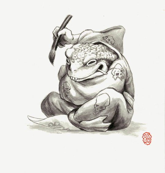 「画鬼」と呼ばれた絵師・河鍋暁斎。 国芳、狩野派等様々な流派から絵を学び才能を発揮するが、「狂斎」とも名乗っていたとおりに度を超えた逸話が多い。ー貧民街で人の喧嘩や口論を観察する、生首を拾って写生する、政府を風刺した絵で逮捕される。そしてびっしりと描き溜めた莫大な量のスケッチ。全ては絵を描くためであり、描けぬものはこの世に無し。薄ら寒さすら感じる描くことへの執念。蛙が大好きなようなので蛙になってもらった。服の模様はスケッチの中に残った様々な骸骨、描いているのは相撲を取るカエルの絵から一匹。(狛)