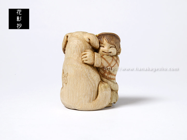 昔、うちでは大型犬を飼っていました。小学校から一緒に育ってきたので末っ子の僕にはいい遊び相手。力は強いのですが気が弱くて、ちょっと情けない表情が大好きでした。ちょっと離れたところに大きな公園と池があるので、長々1時間かけて散歩に連れて行ったのはいい思い出です。モデルを僕にするには照れくさいもので、子供姿の奥さんとうちの犬に仲良しになってもらって作品にしました。(狛)