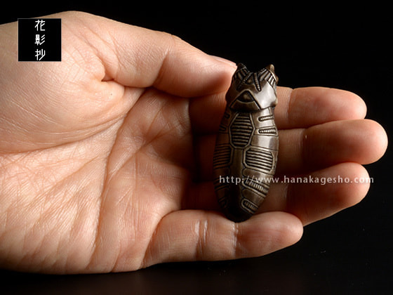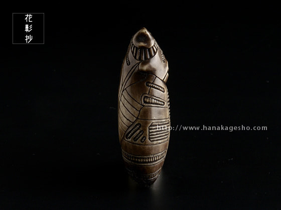 「“生物の機械化”というテーマを掲げてみて、制作の際に強く“未来”という事を意識するようになりました。今回のモチーフは1作目に引き続き、蝶の蛹です。いつの日かヒトが生物を改造するのか、生物がヒトの文化を取り込むのか、はたまた、ヒトが絶滅した後の世界で生物が進化を果たすのか…。この根付が完成した際、願わくばここから生まれてくる蝶もまた、美しい生物であってほしいと感じました」(カタクラケンタ)